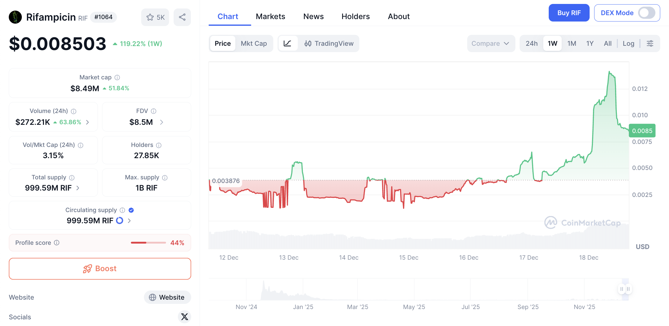 Dalam 24 jam terakhir, RIF melonjak tajam hingga 51.62%, sementara kenaikan selama 7 hari tembus 119.34%. Volume transaksi 24 jam tercatat $272,163, dengan suplai beredar 31.36M RIF dari total suplai 999.59M RIF.