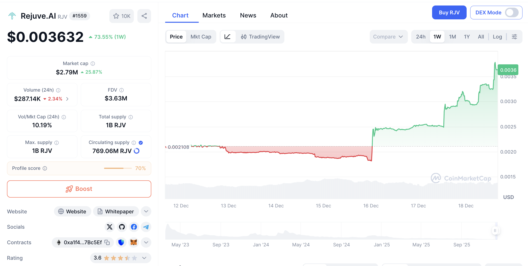 Rejuve.AI (RJV) menempati posisi berikutnya dengan kapitalisasi pasar $2,799,387 dan harga token $0.003639.