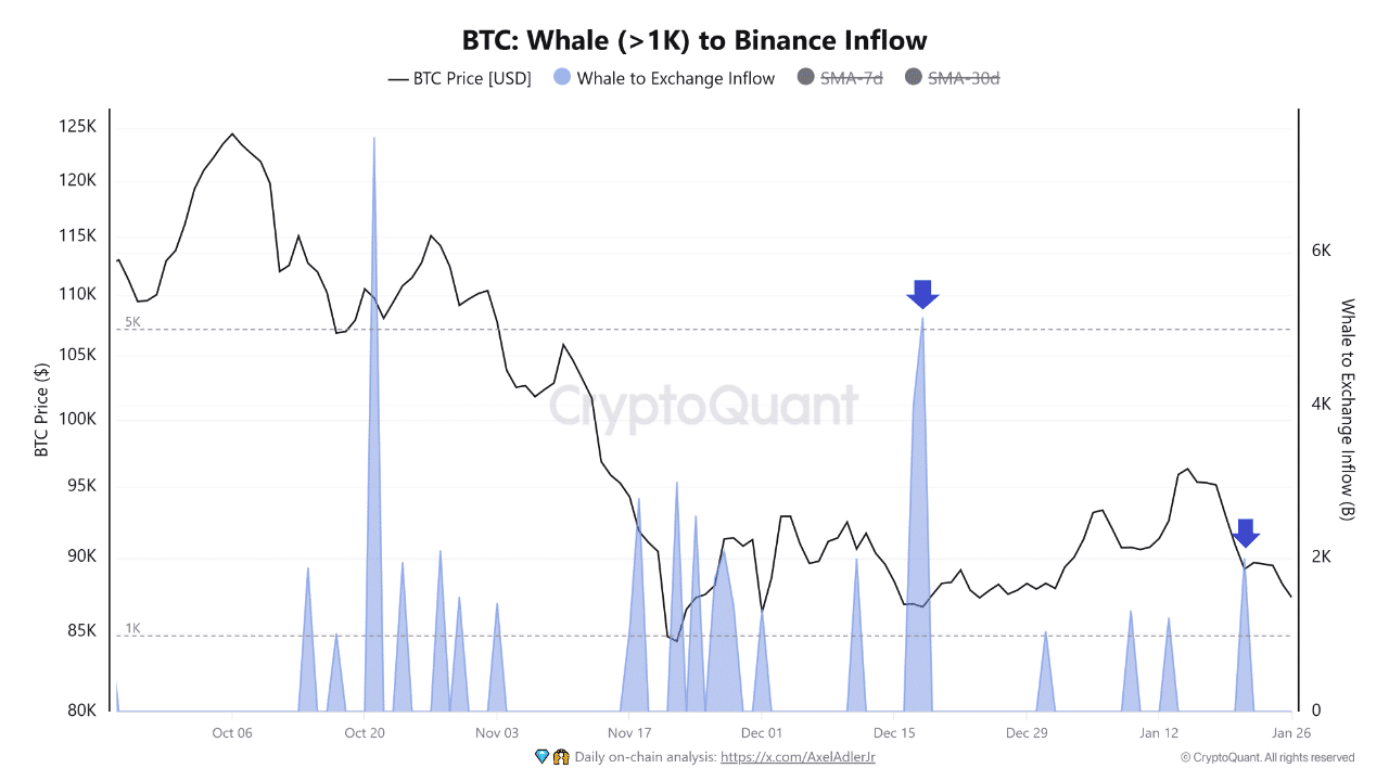 Salah satu pemicu utama penurunan Bitcoin adalah aktivitas whale, yaitu investor besar yang memegang aset dalam jumlah masif. Data menunjukkan adanya arus masuk (inflow) signifikan sebesar 2.000 BTC ke bursa Binance.