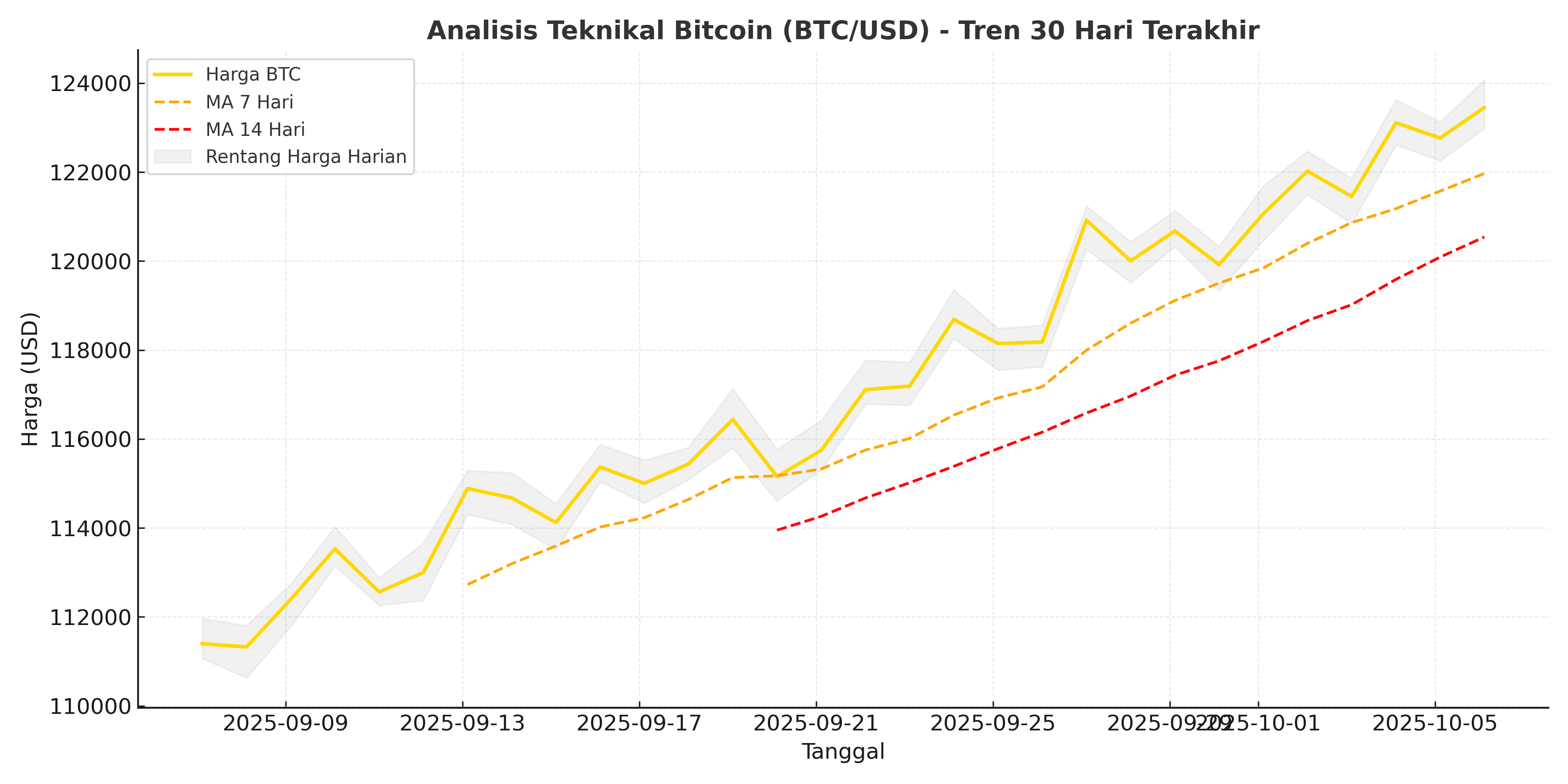 - Moving Average 50-Hari: tetap di bawah harga pasar, menandakan tren jangka menengah masih positif.