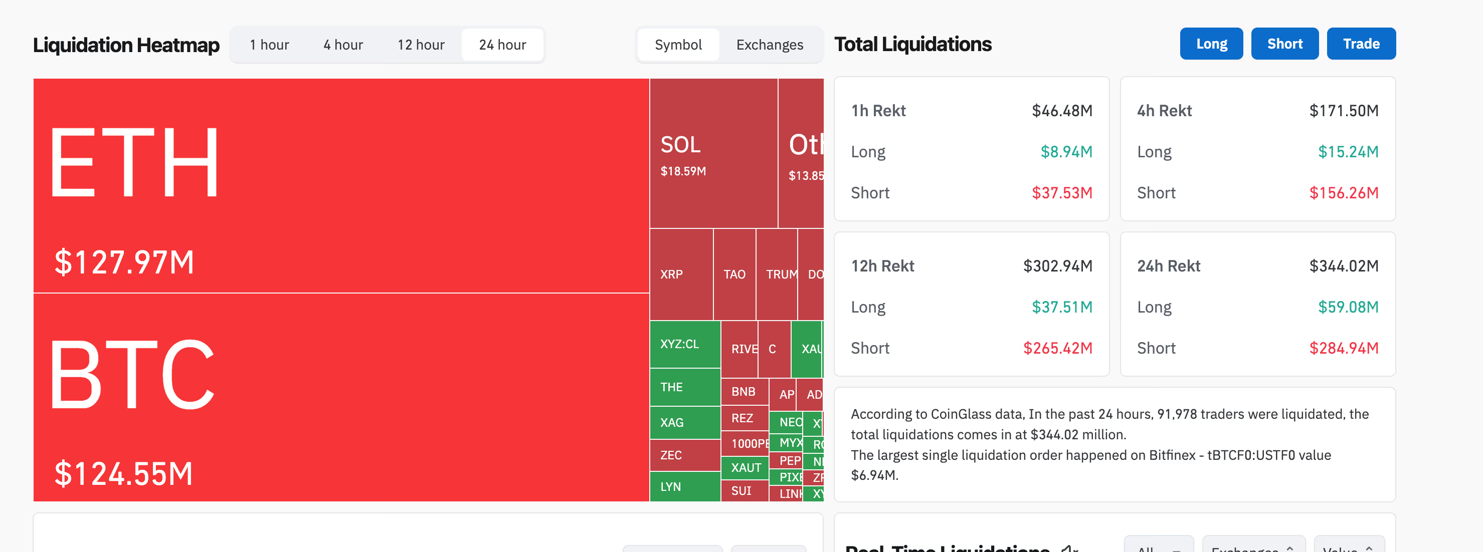 Data dari CoinGlass menunjukkan bahwa sekitar US$344 juta posisi trading dilikuidasi dalam 24 jam terakhir yang melibatkan lebih dari 91.000 trader.
