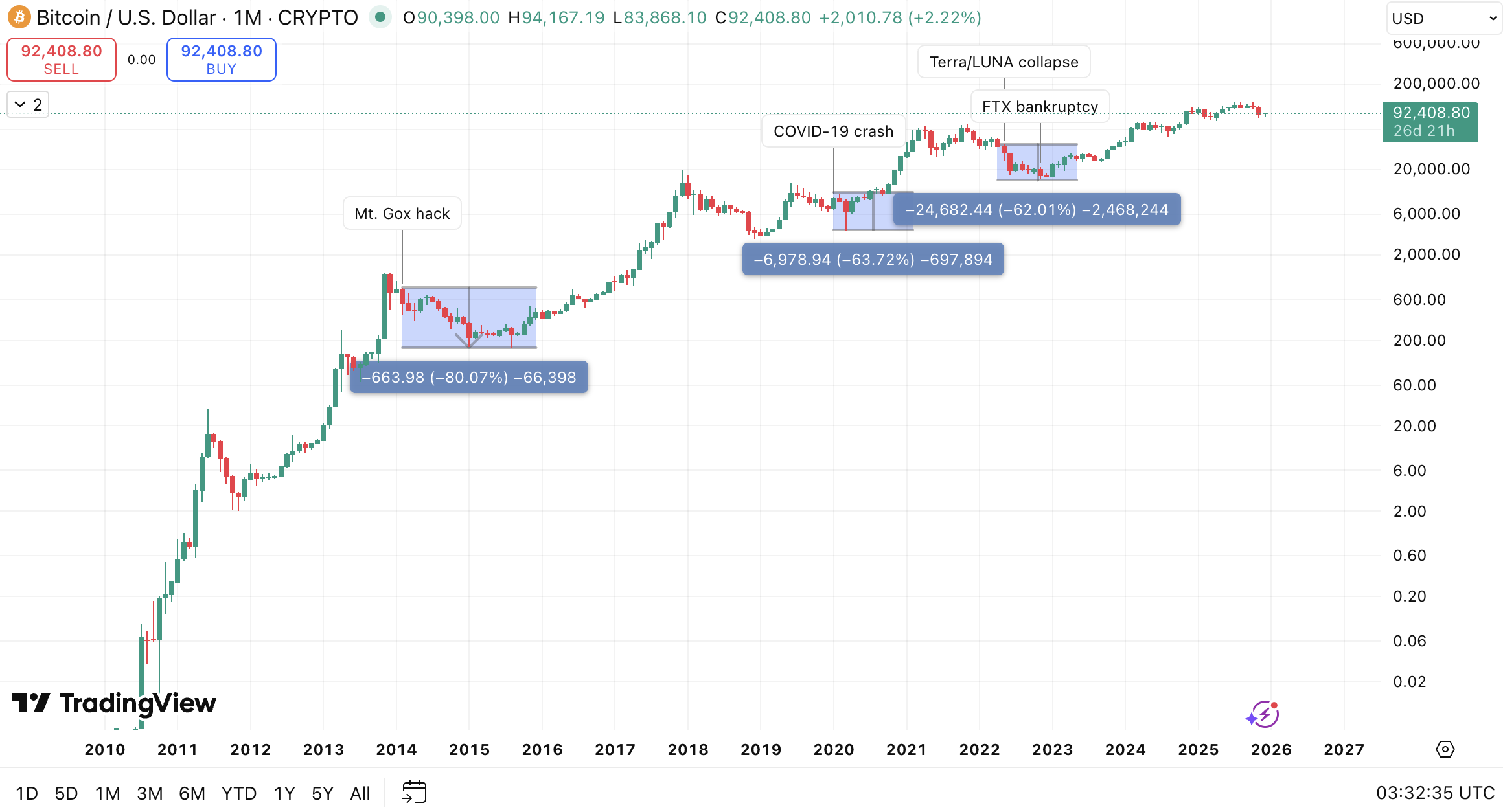 Sebut saja peristiwa black swan seperti peretasan Mt. Gox, COVID-19 Crash, dan runtuhnya Terra LUNA. Semua peristiwa ini berhasil membuat pasar crypto yang diwakili oleh Bitcoin mengalami penurunan lebih dari 50% dalam waktu singkat.