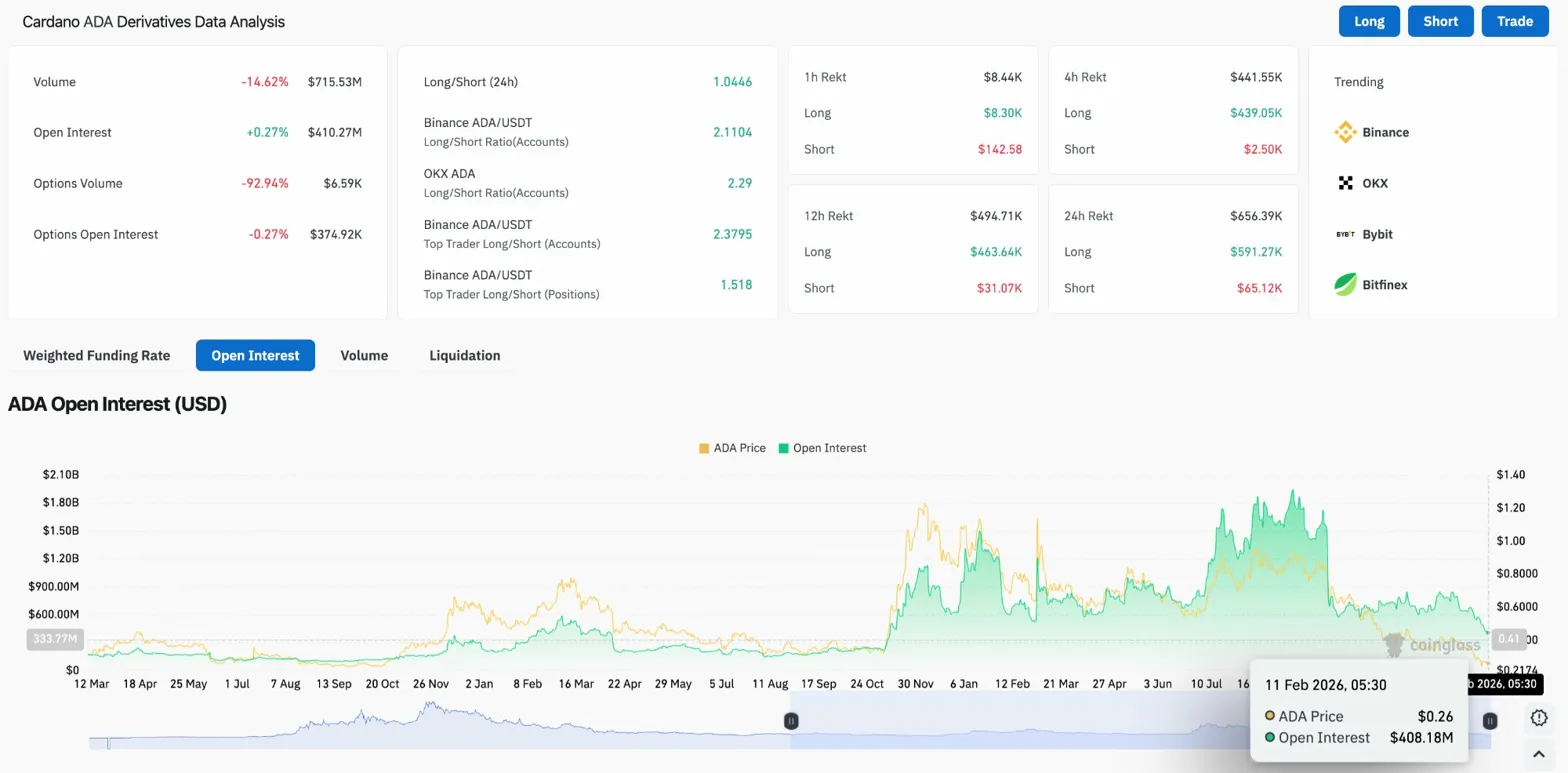 Di sisi derivatif, data Coinglass menunjukkan open interest (OI) justru naik tipis 0,27% menjadi US$410,27 juta. Kenaikan ini terjadi di tengah tekanan harga, mengindikasikan bahwa sebagian trader membangun kembali posisi pada level yang lebih rendah, alih-alih menutup eksposur sepenuhnya. Namun, volume perdagangan turun 14,62% menjadi US$715,53 juta, mencerminkan partisipasi pasar yang melemah.