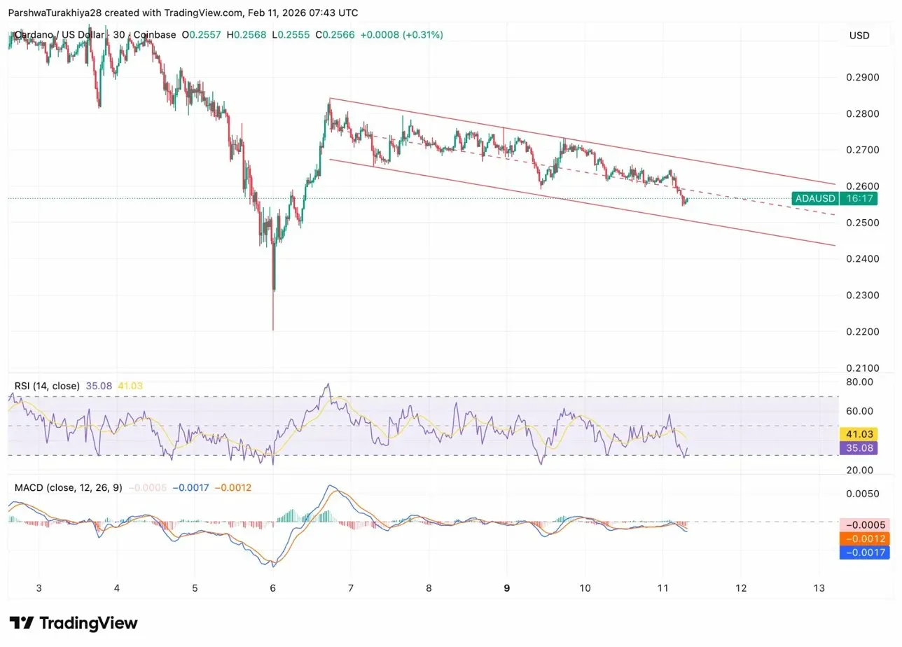 Dalam timeframe intraday 30 menit, harga bergerak dalam pola descending channel dengan batas bawah di sekitar US$0,2555. Relative Strength Index (RSI) berada di 35, mendekati area jenuh jual namun belum menunjukkan sinyal pembalikan yang jelas. Indikator MACD masih berada di wilayah negatif, memperkuat momentum bearish jangka pendek.