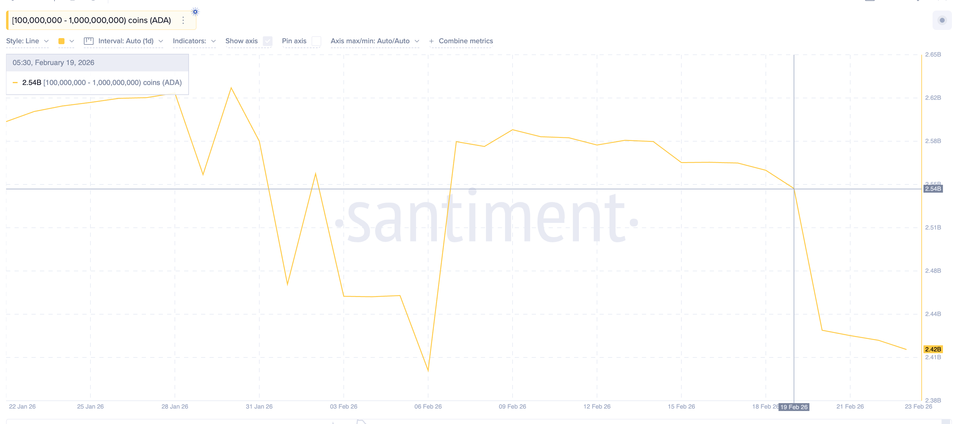Kelompok whale yang memegang antara 100 juta hingga 1 miliar ADA mulai mengurangi eksposur bahkan sebelum pola breakdown terkonfirmasi pada 22 Februari. Pada 19 Februari, kelompok ini tercatat memegang sekitar 2,54 miliar ADA. Namun pada 23 Februari, jumlah tersebut turun menjadi 2,42 miliar ADA.
