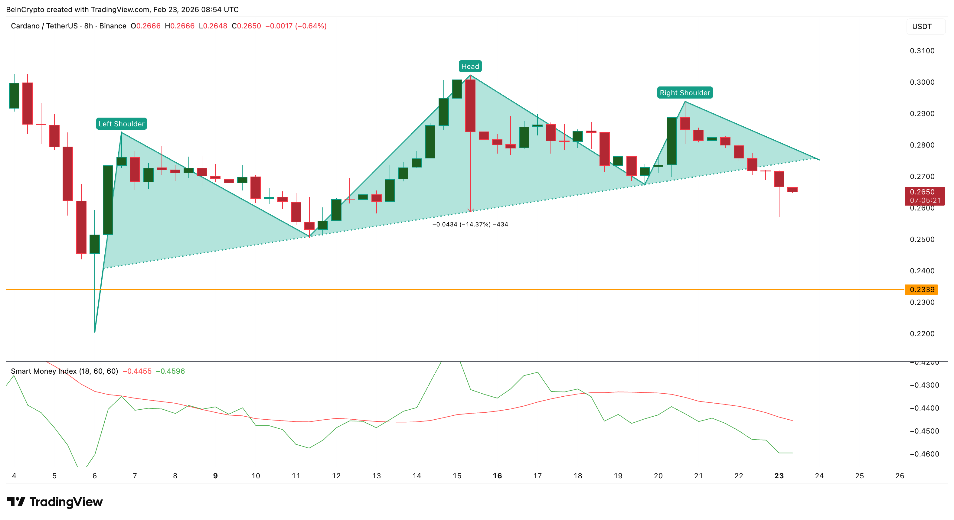 Secara teknikal, breakdown dari pola head and shoulders pada grafik 8 jam memperkuat bias bearish. Indeks Smart Money (SMI), yang melacak pergerakan investor berpengalaman, juga menunjukkan divergensi negatif saat harga menembus support.