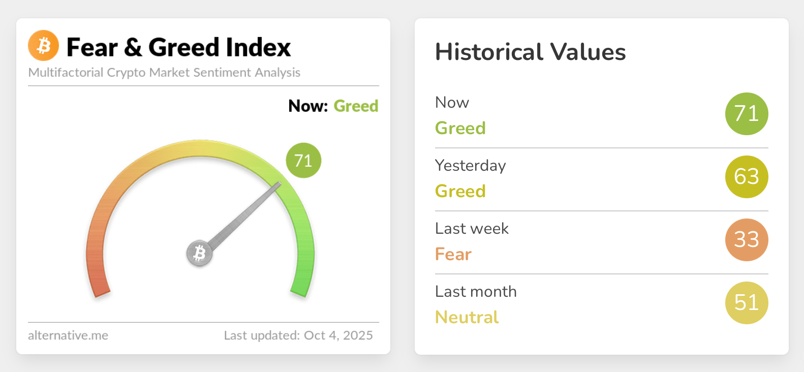 Sementara itu, versi lain dari indeks serupa di Alternative.me (CFGI) menunjukkan hasil yang lebih ekstrem: 71 poin hari ini, naik dari 63 kemarin dan 33 minggu lalu. Dengan kata lain, hanya dalam seminggu, pasar kripto telah berubah dari “takut” menjadi “serakah”.