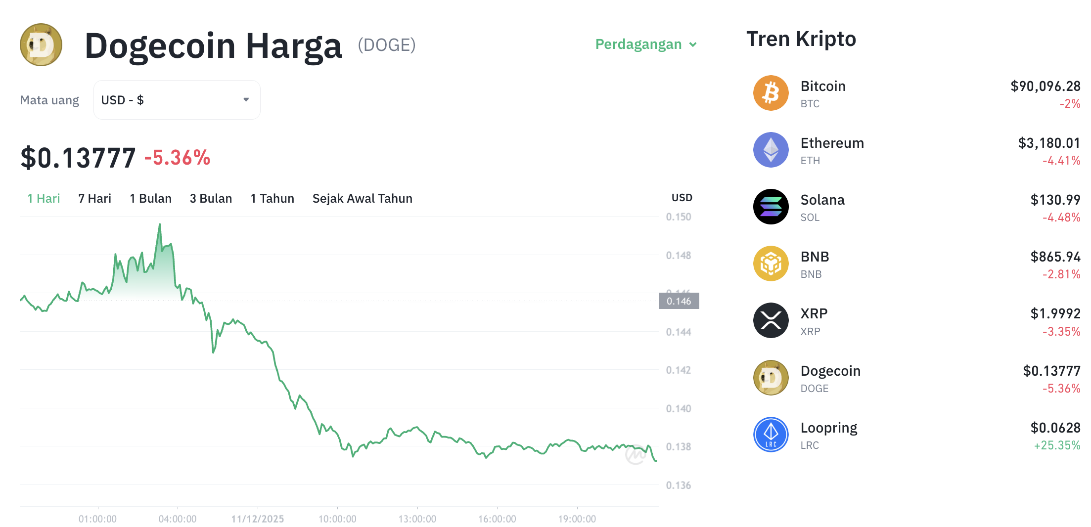 Harga Dogecoin bertahan di level $0,13 meski mengalami penurunan 5% dalam 24 jam terakhir. Kondisi ini terjadi di tengah tekanan pasar kripto yang melemah. Sepanjang hari, DOGE diperdagangkan di bawah $0.14, mencerminkan tren bearish yang melanda seluruh pasar.