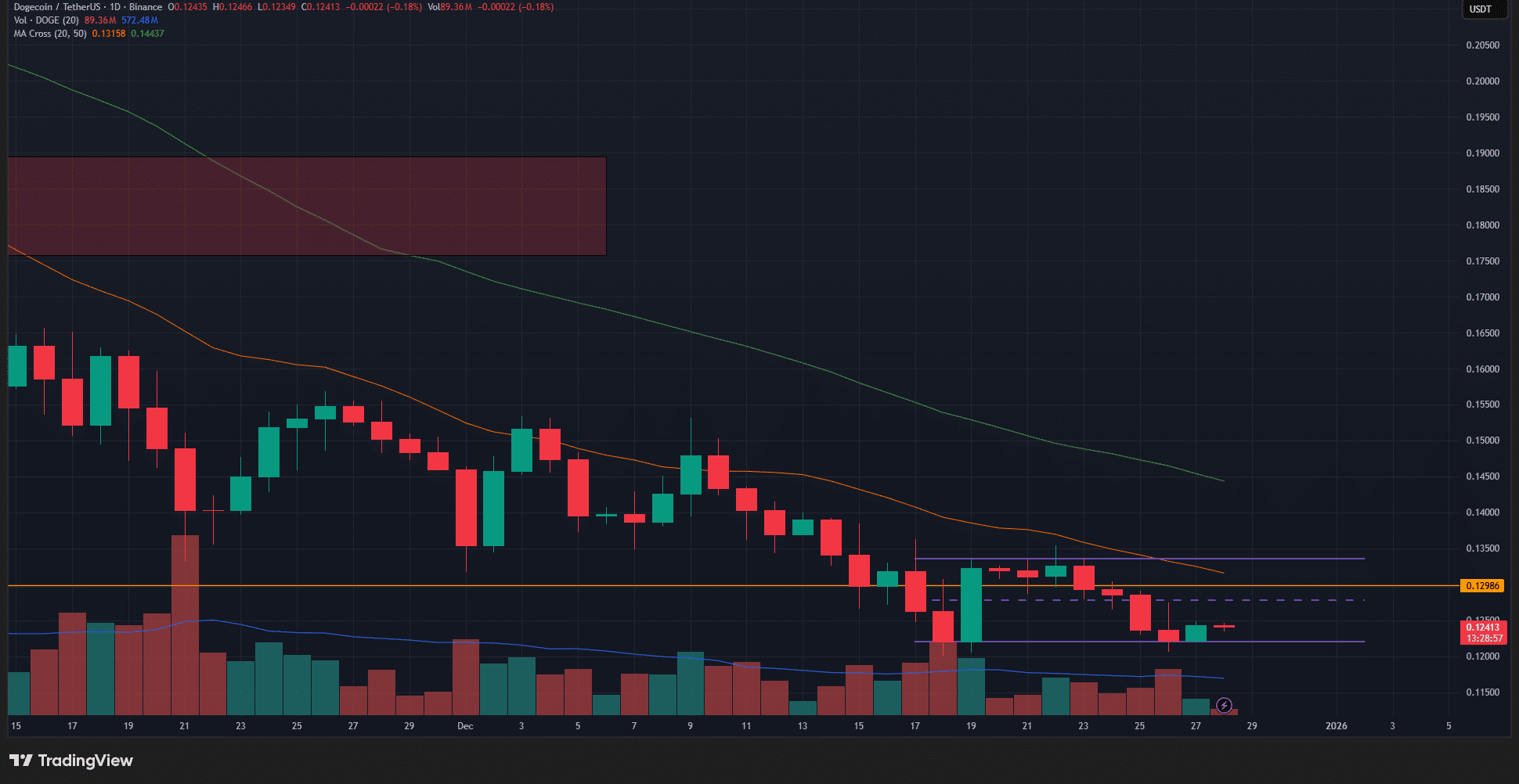 Dari sisi teknikal, harga Dogecoin terlihat mulai bergerak dalam rentang sempit. Dalam grafik harian, DOGE diperdagangkan di kisaran USD 0,122 hingga USD 0,133 selama sekitar sepuluh hari terakhir. Meski tren besar masih bearish, pola ini menunjukkan fase konsolidasi alih-alih penurunan tajam lanjutan.