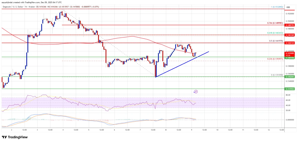 Pemulihan ini terjadi setelah DOGE rebound dari level rendah $0,1350, mengikuti jejak penguatan Bitcoin dan Ethereum. Harga bahkan melampaui level Fibonacci retracement 23,6% dari penurunan sebelumnya antara $0,1532 hingga $0,1351. Namun, tekanan jual kembali muncul ketika harga mendekati area $0,1440–$0,1450.