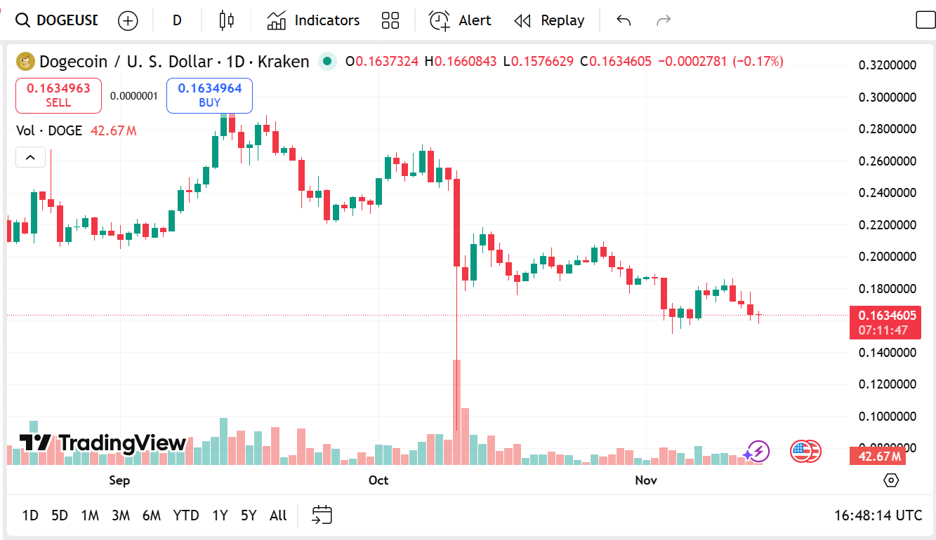 Saat ini Dogecoin diperdagangkan di 0,1635 dolar, setelah turun sekitar 4,41 persen dalam 24 jam terakhir. Kapitalisasi pasarnya tetap besar, mencapai 24,93 miliar dolar—menegaskan bahwa DOGE masih menjadi salah satu token paling berpengaruh di industri kripto.