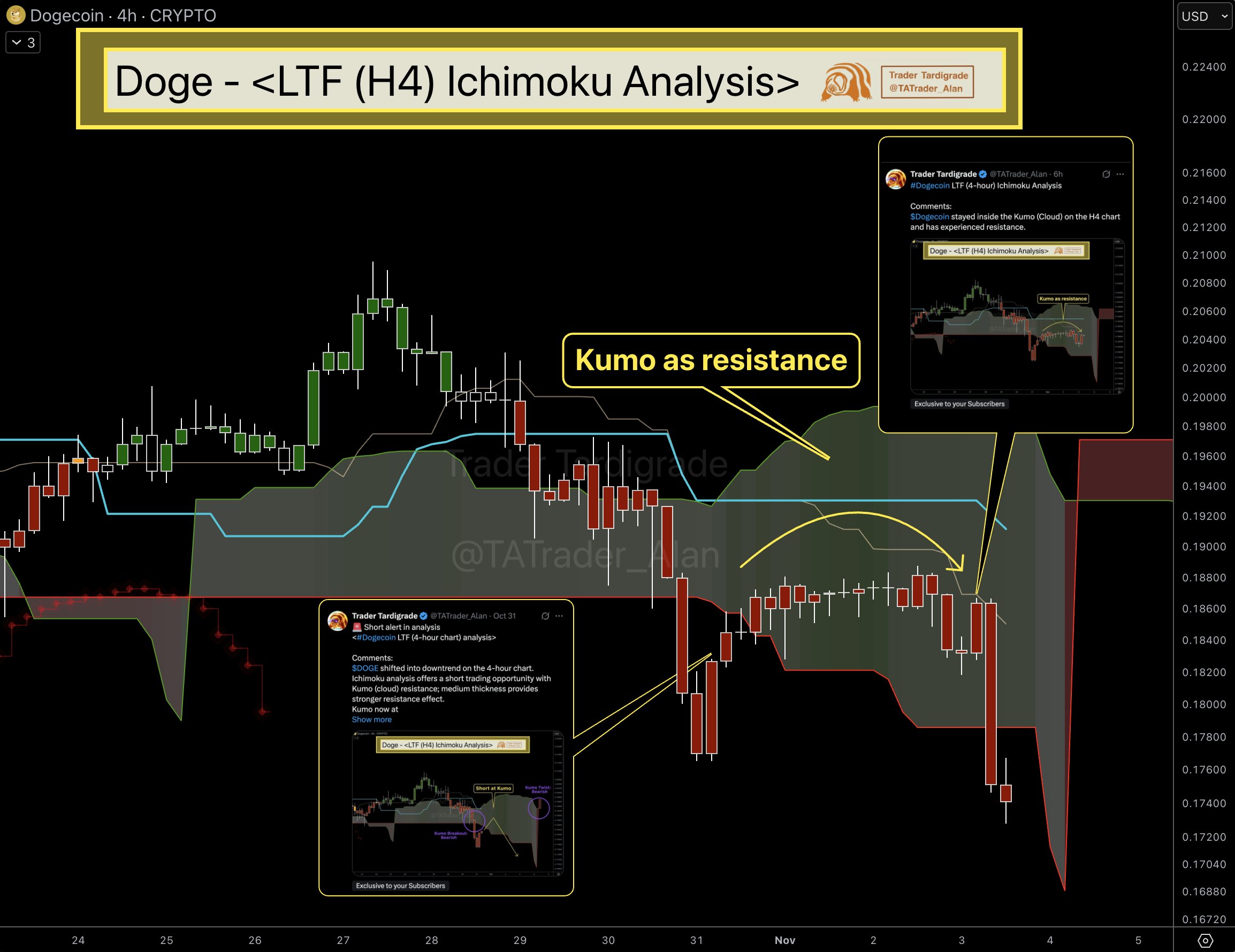 Dilaporkan AMBCrypto, secara teknikal, grafik DOGE menunjukkan momentum bearish yang jelas. Harga telah menembus ke bawah awan Ichimoku pada time frame 4 jam, sinyal kuat bahwa tekanan jual mendominasi pasar. Target harga jangka pendek berikutnya diperkirakan berada di sekitar $0,1688.