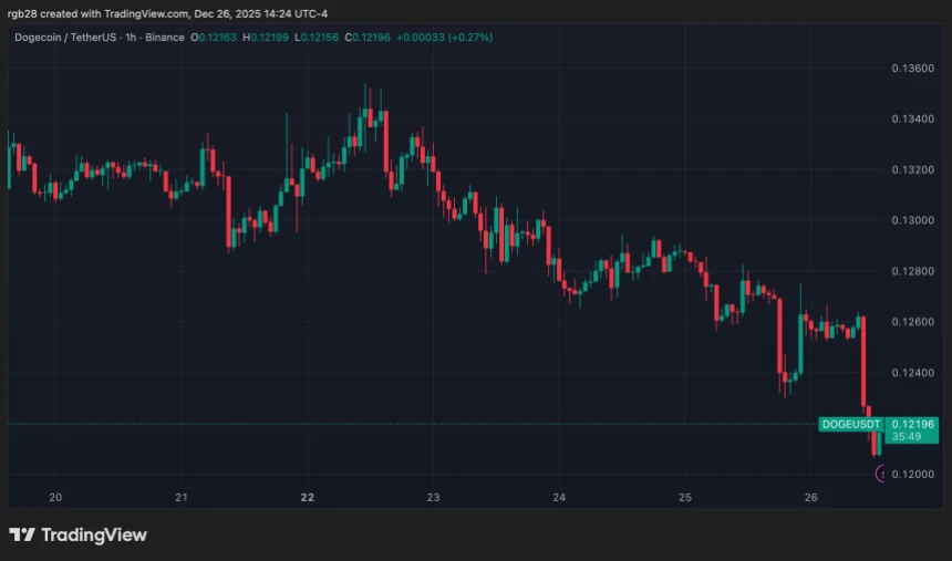 Pada Jumat (27/12), Dogecoin mencatat penurunan intraday sekitar 4,2% dan sempat menyentuh area US$0,126 di tengah volatilitas pasar yang masih tinggi. Secara keseluruhan, DOGE telah terkoreksi lebih dari 50% dari puncak harga awal Oktober dan kehilangan beberapa level support penting dalam dua bulan terakhir.