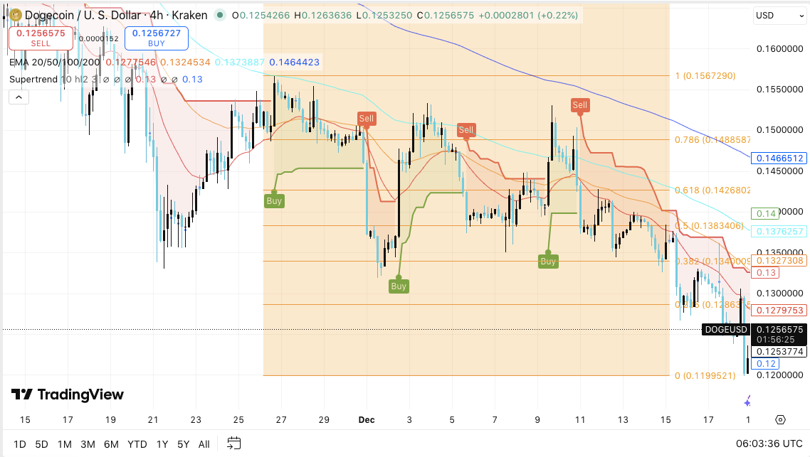 Dilaporkan Coinedition, area support terdekat berada di kisaran US$0,1250–US$0,1235. Namun, level US$0,120 menjadi titik psikologis dan struktural yang krusial. Jika level ini jebol, DOGE berpotensi melanjutkan penurunan ke area US$0,115.