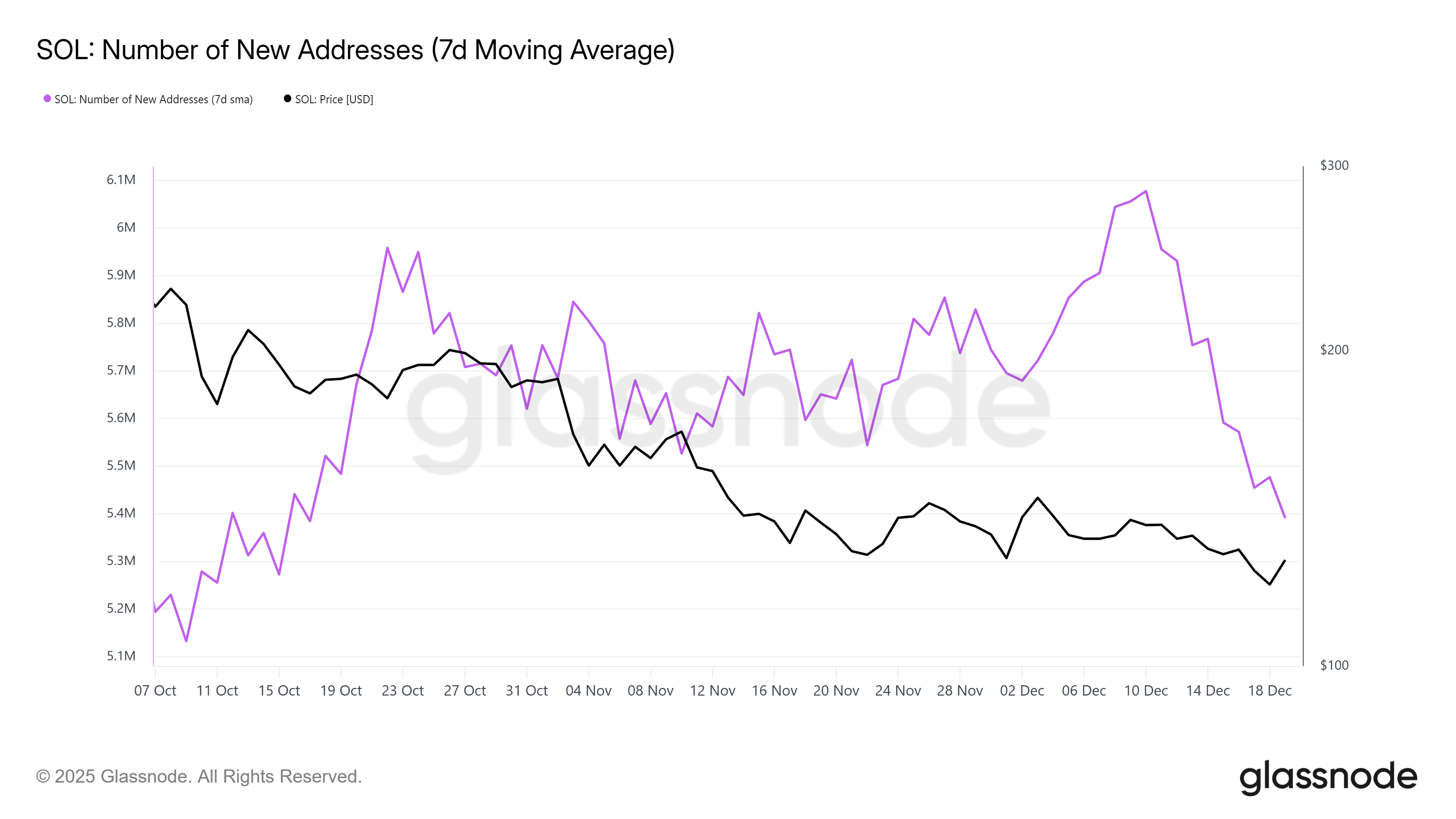 Di sisi lain, indikator makro jaringan menunjukkan sinyal yang lebih hati-hati. Jumlah alamat baru di jaringan Solana tercatat turun signifikan dalam 10 hari terakhir. Data menunjukkan penurunan dari 6,077 juta alamat menjadi 5,390 juta alamat, atau turun sekitar 11,3%. Penurunan ini mencerminkan melemahnya partisipasi jaringan dan rendahnya minat spekulatif dari investor baru.