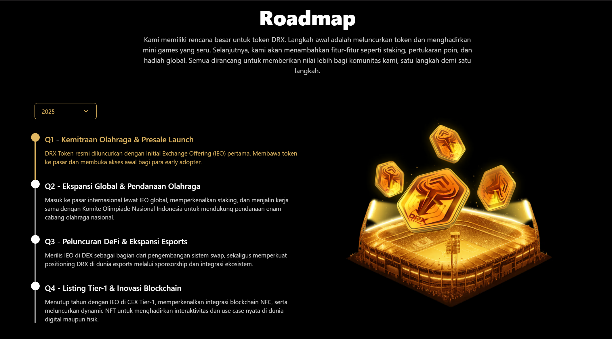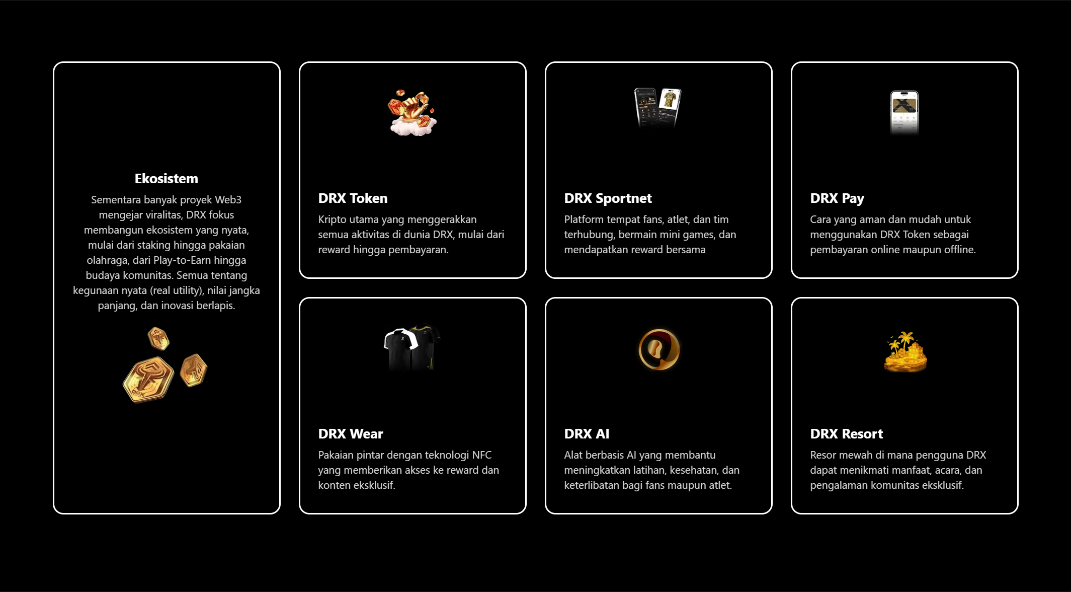 Sebagai pusat dari seluruh aktivitas, DRX Token berperan sebagai alat utilitas utama: mulai dari akses event, reward, hingga produk eksklusif. Proyek ini tidak hanya menawarkan konsep, tetapi juga menghadirkan solusi nyata bagi industri olahraga dan gaya hidup digital.