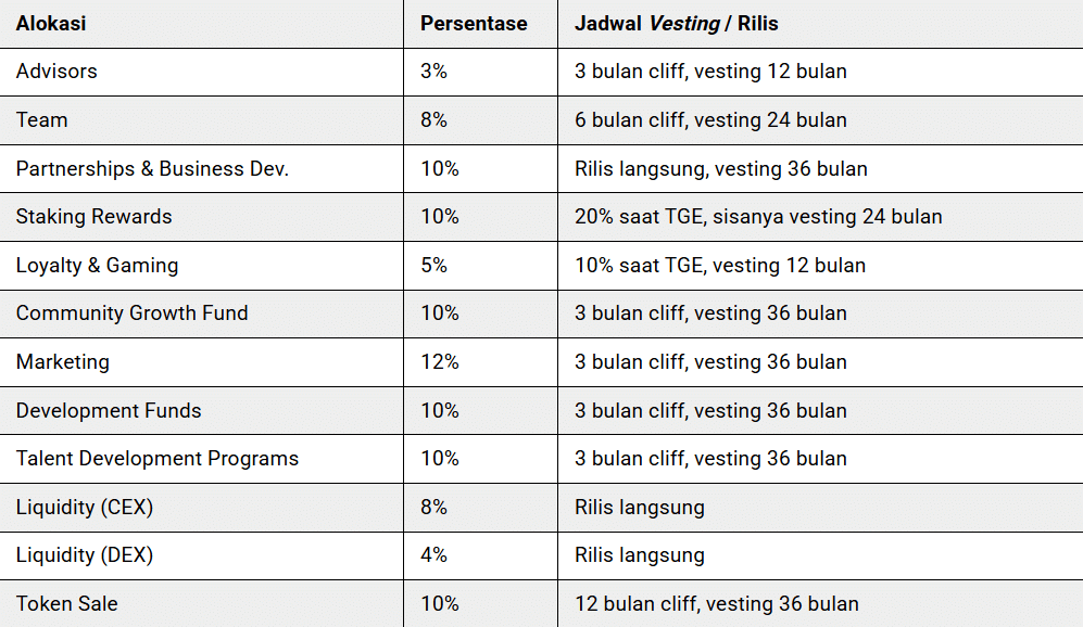 • Distribusi dengan vesting hingga 3 tahun, memastikan pertumbuhan organik dan mencegah tekanan jual besar.