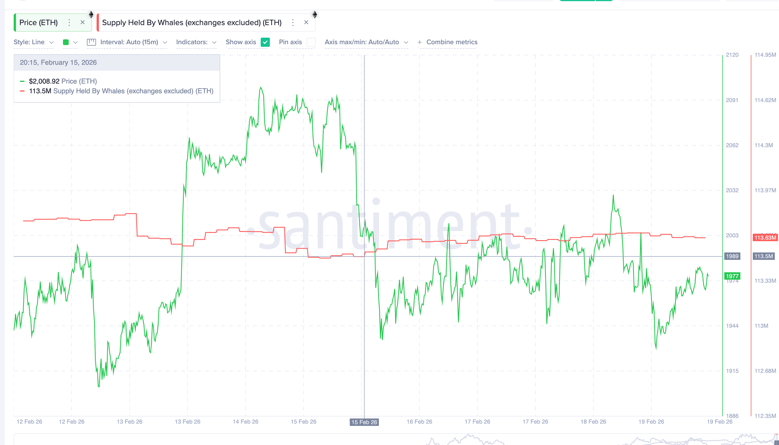 Selain itu, data Santiment menunjukkan wallet whale meningkatkan kepemilikan dari 113,50 juta ETH pada 15 Februari menjadi 113,63 juta ETH saat ini. Penambahan sekitar 130.000 ETH tersebut setara dengan akumulasi senilai sekitar US$253 juta dalam beberapa hari terakhir.