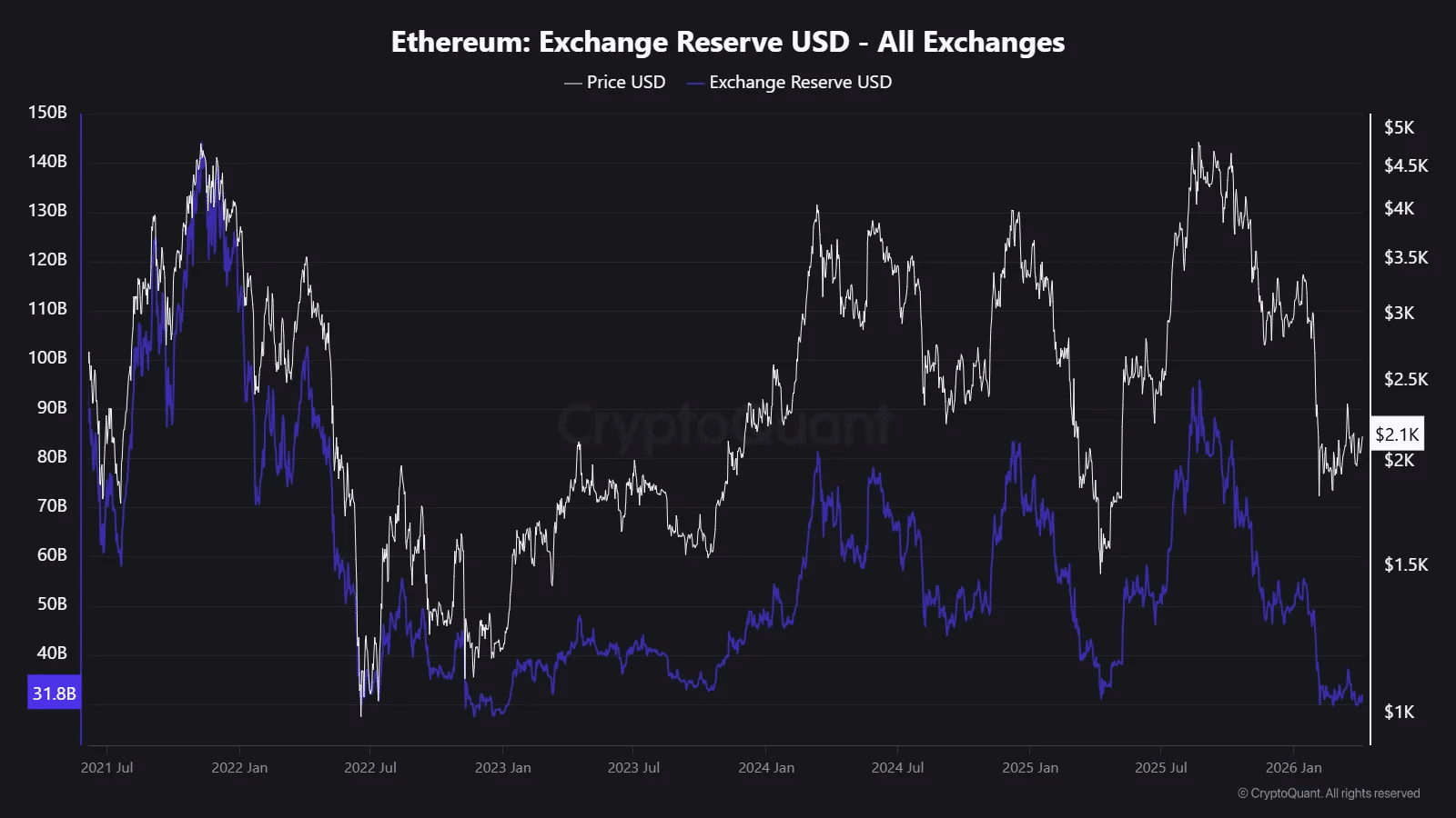 Data terbaru menunjukkan bahwa nilai cadangan Ethereum di seluruh exchange kini hanya sekitar 31,8 miliar dolar AS, menjadi titik terendah sejak pencatatan dimulai pada pertengahan 2021.