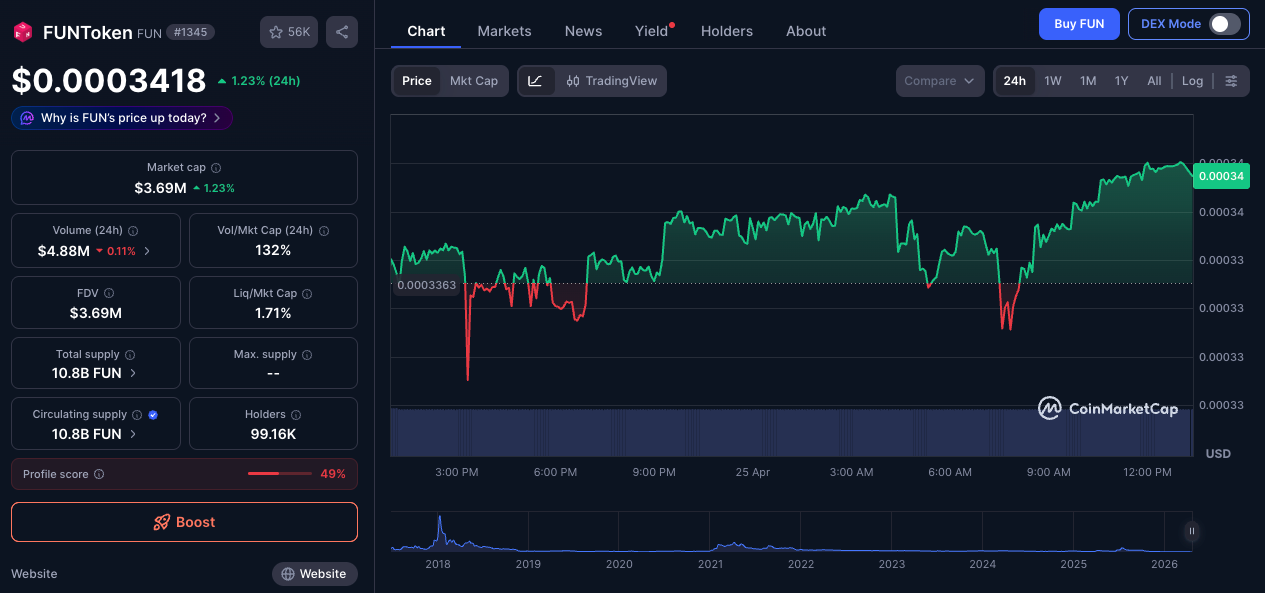Di sisi pasar, harga token FUN juga mengalami kenaikan tipis sekitar 0,15 persen dalam 24 jam terakhir, diperdagangkan di kisaran US$0,0003377 dengan kapitalisasi pasar sekitar US$3,64 juta.