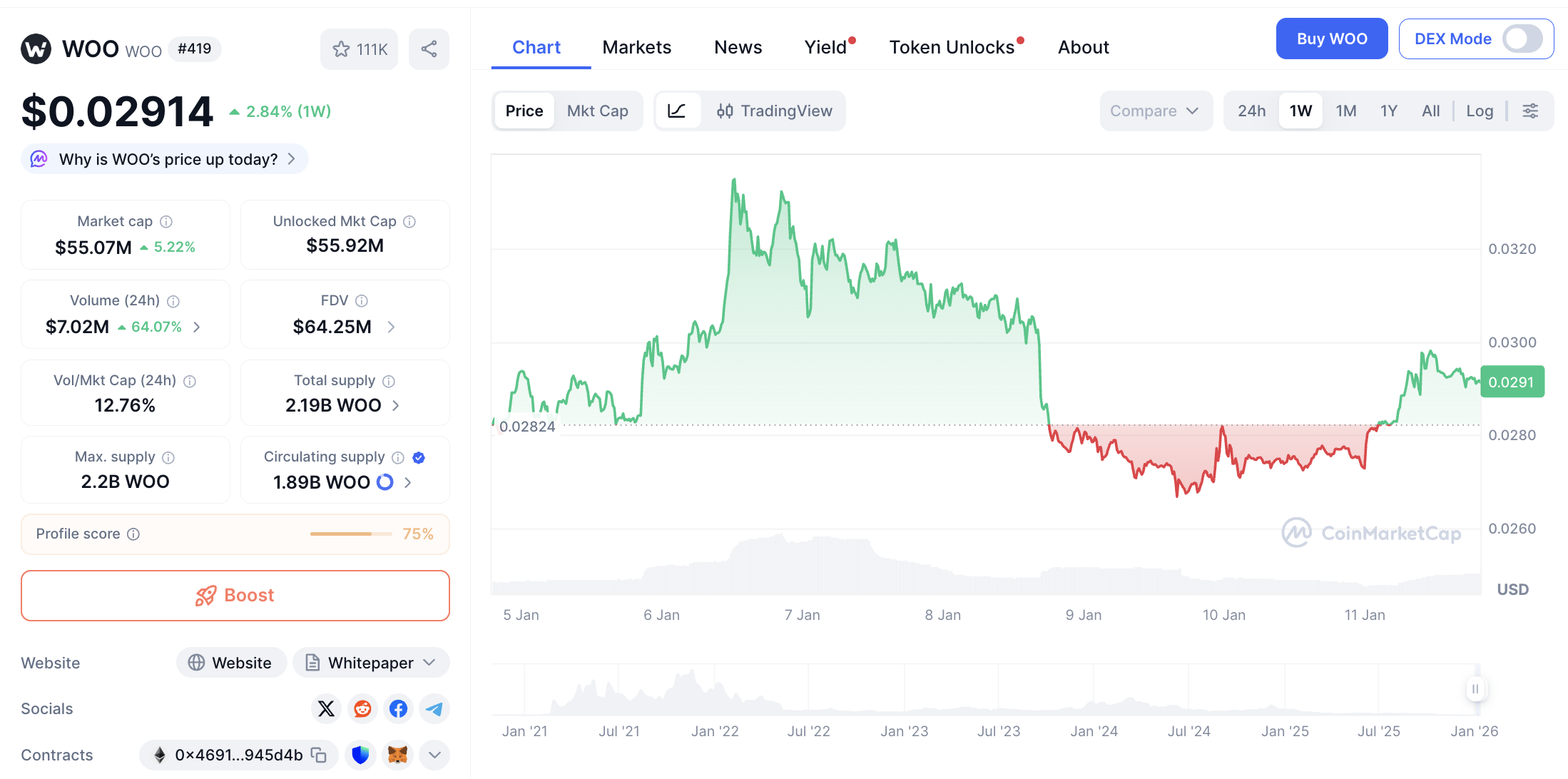 Kapitalisasi pasar WOO mencapai $55,062,824 dengan volume transaksi harian sebesar $7,021,661. Jumlah suplai yang beredar berada di angka 238.67M dari total suplai 1.89B WOO.