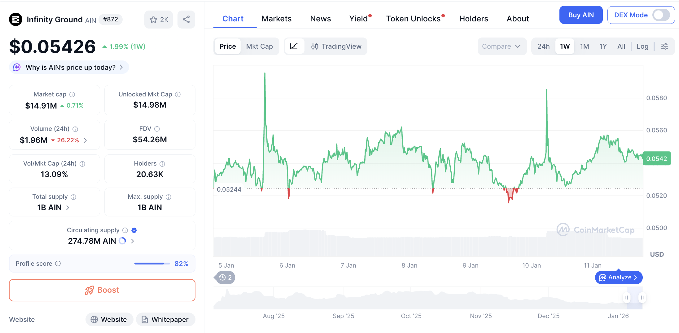Di posisi berikutnya ada Infinity Ground dengan harga $0.05477 per token. AIN mengalami kenaikan 4.03% dalam 24 jam dan menguat 5.02% selama 7 hari terakhir.