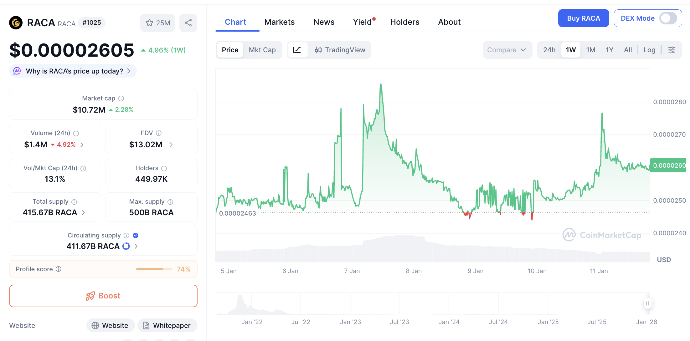 Volume perdagangan RACA tercatat sebesar $1,406,312 per 24 jam, dengan suplai beredar mencapai 54.04B dari total suplai 411.67B RACA.