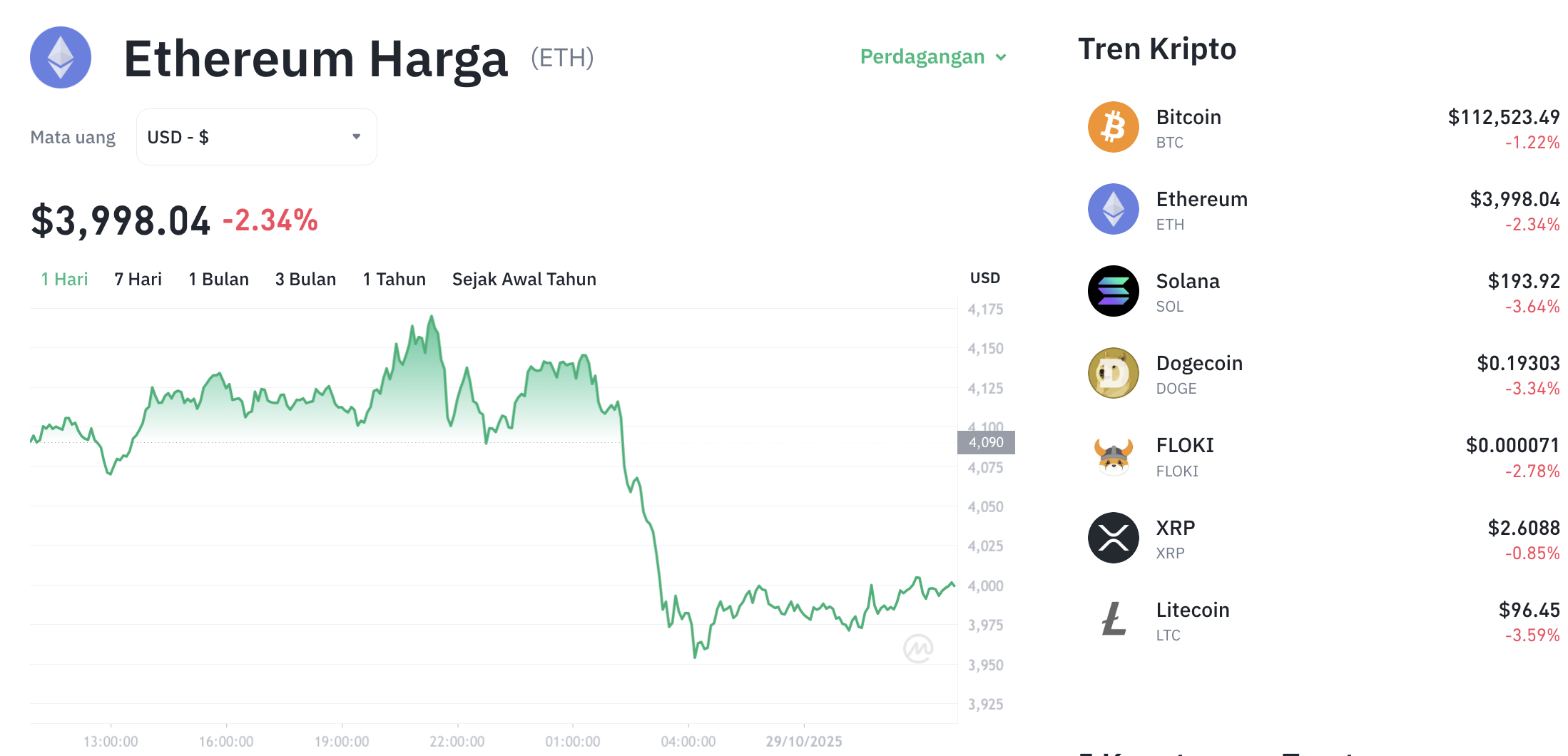 Harga Ethereum (ETH) Turun 2,26% ke $4.001, Koreksi Sehat Sementara