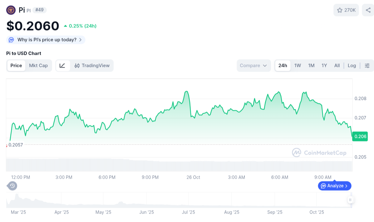 Harga Pi Network (PI) mengalami kenaikan 0,65% dalam 24 jam terakhir, meski masih sedikit di bawah performa pasar kripto global (+0,33%).