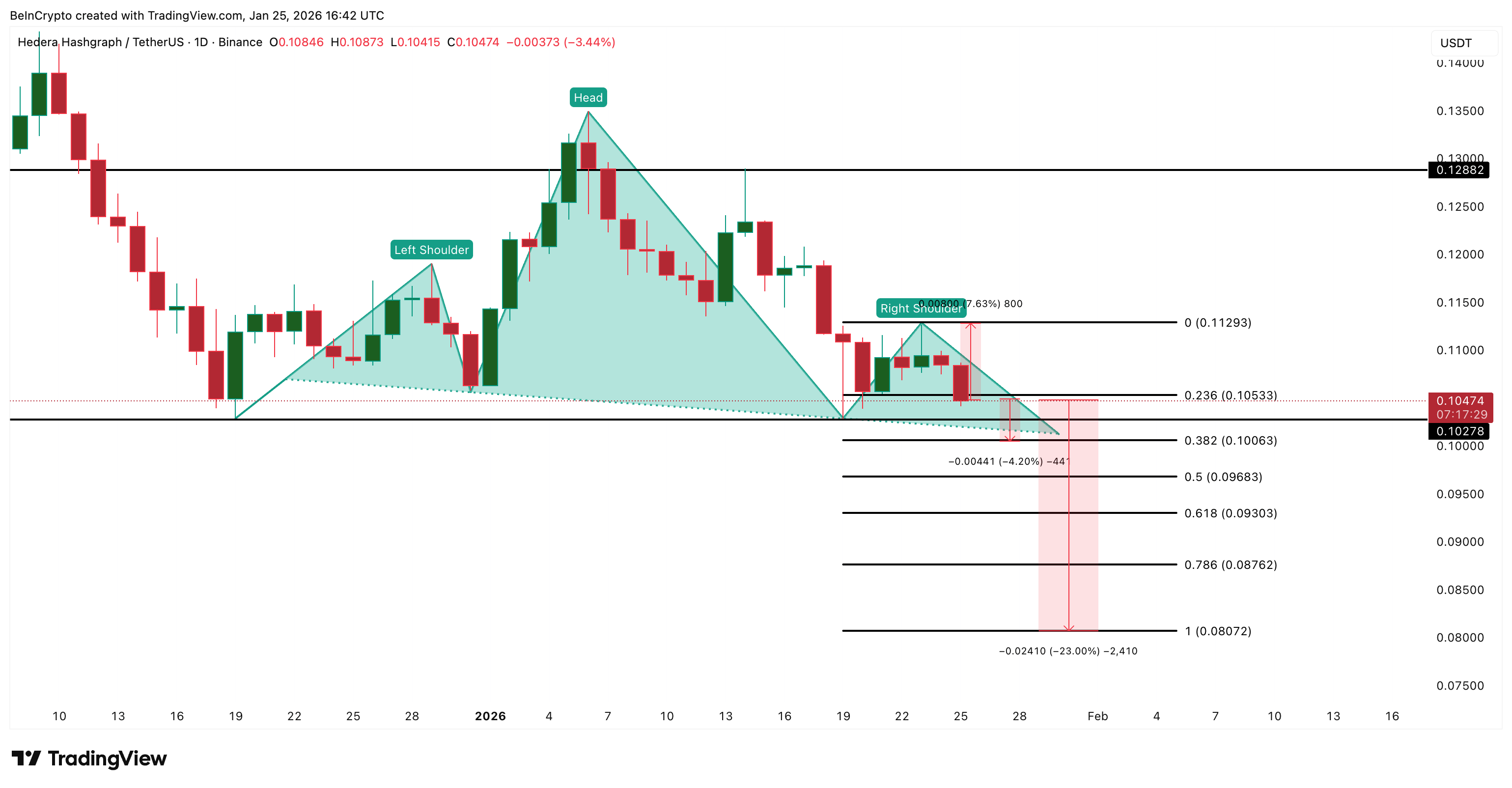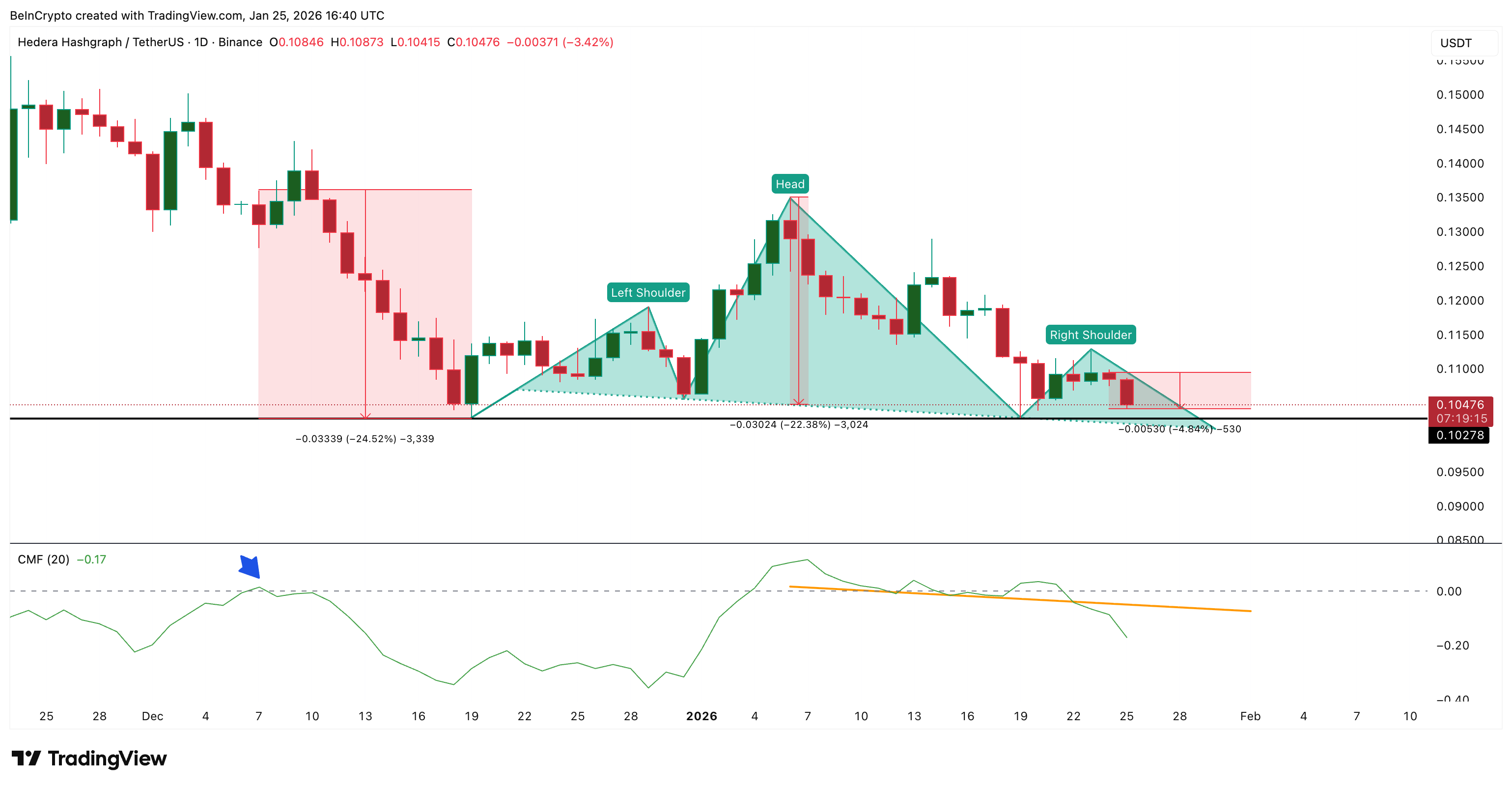 Dari sisi teknikal, pergerakan harga HBAR mendekati penyempurnaan pola head-and-shoulders, yang secara historis sering menjadi sinyal pembalikan bearish. Garis leher (neckline) pola ini berada di kisaran US$0,102.