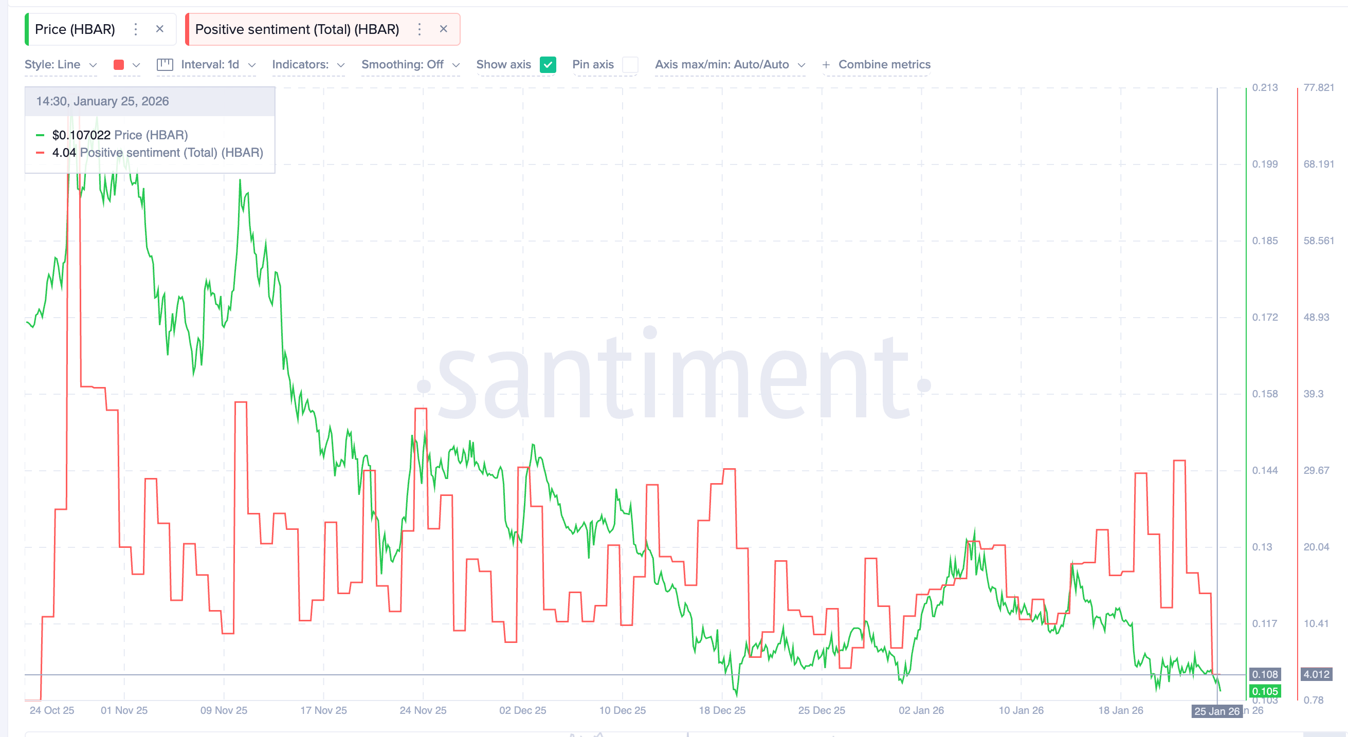 Dilaporkan BeInCrypto, tekanan teknikal juga sejalan dengan memburuknya sentimen pasar. Data sentimen menunjukkan tingkat pembicaraan positif terhadap Hedera turun ke titik terendah sejak akhir Oktober.