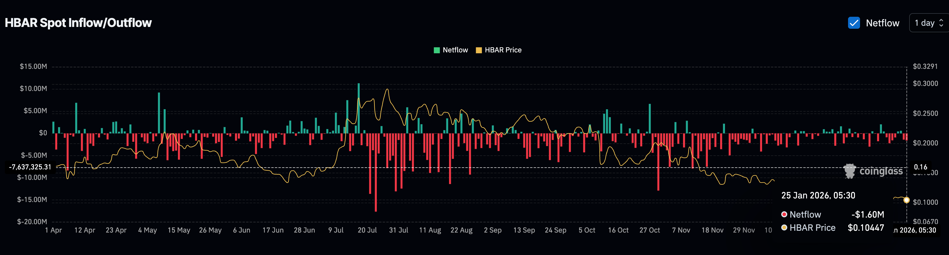 Meski tekanan bearish menguat, sejumlah data menunjukkan masih adanya minat beli di level bawah. Dalam dua hari terakhir, tercatat net outflow dari bursa spot saat harga HBAR terkoreksi hampir 5%.