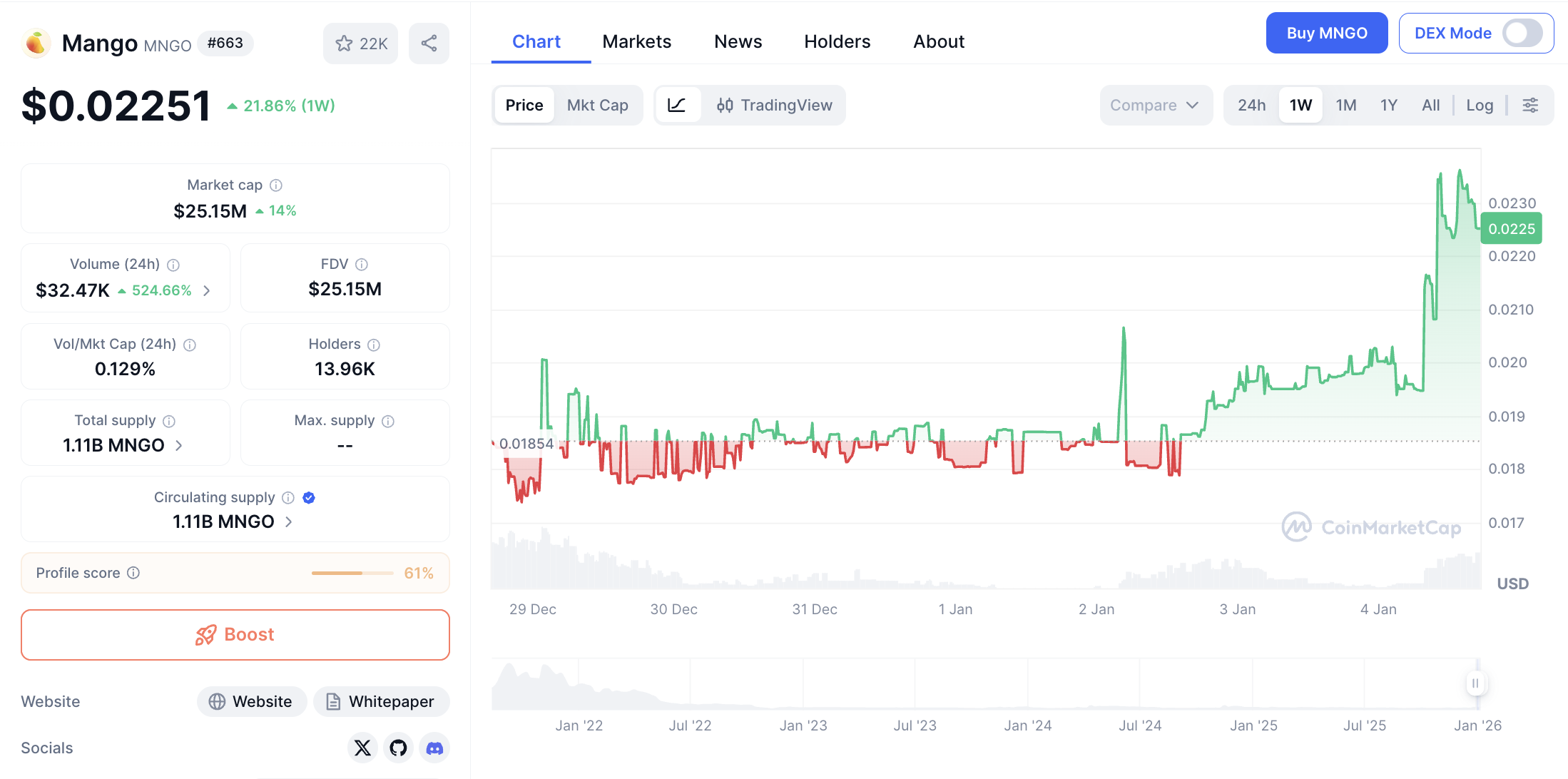 Mango Markets (MNGO) masuk dalam daftar 3 besar altcoin perp DEX dengan kapitalisasi pasar $25,718,778. Token ini diperdagangkan di harga $0.02301, melonjak 16.58% dalam 24 jam dan menguat 23.35% dalam 7 hari terakhir.