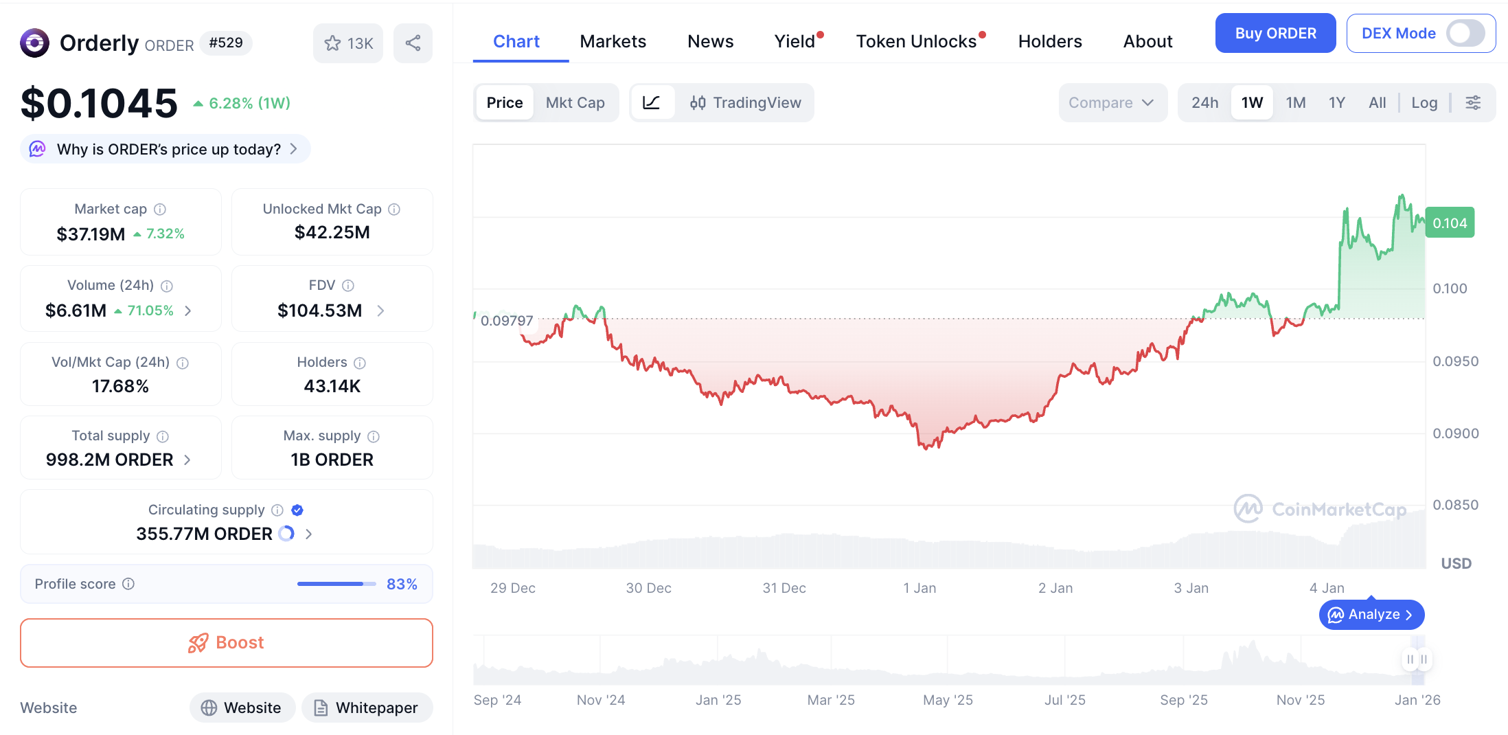 ORDER juga menunjukkan likuiditas yang cukup solid dengan volume perdagangan 24 jam sebesar $6,388,685. Jumlah suplai beredar mencapai 355.77M ORDER, sementara suplai yang sudah beredar di pasar sebesar 61.35M ORDER.