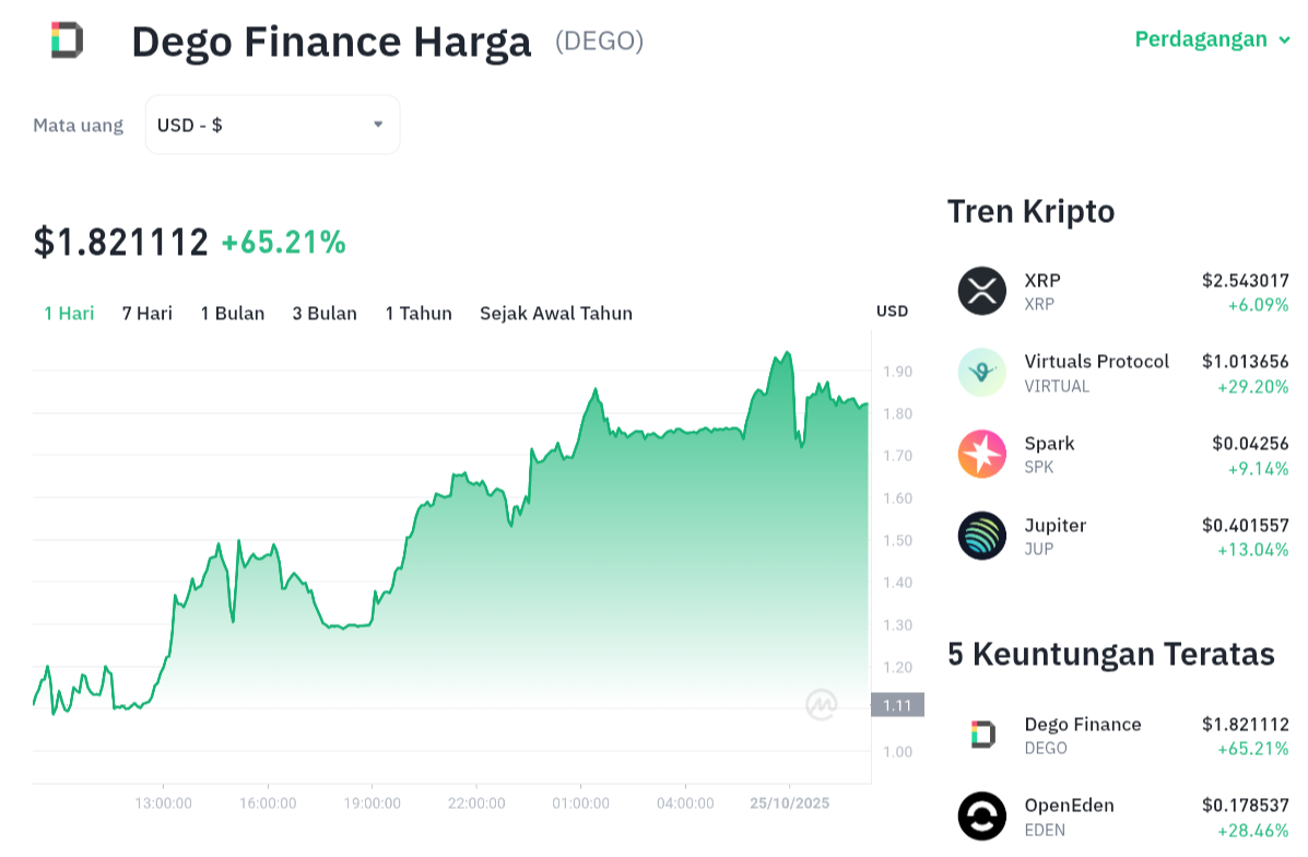 Lonjakan harga Dego Finance (DEGO) hingga 65% dalam 24 jam menjadi sorotan penting di pasar aset digital.