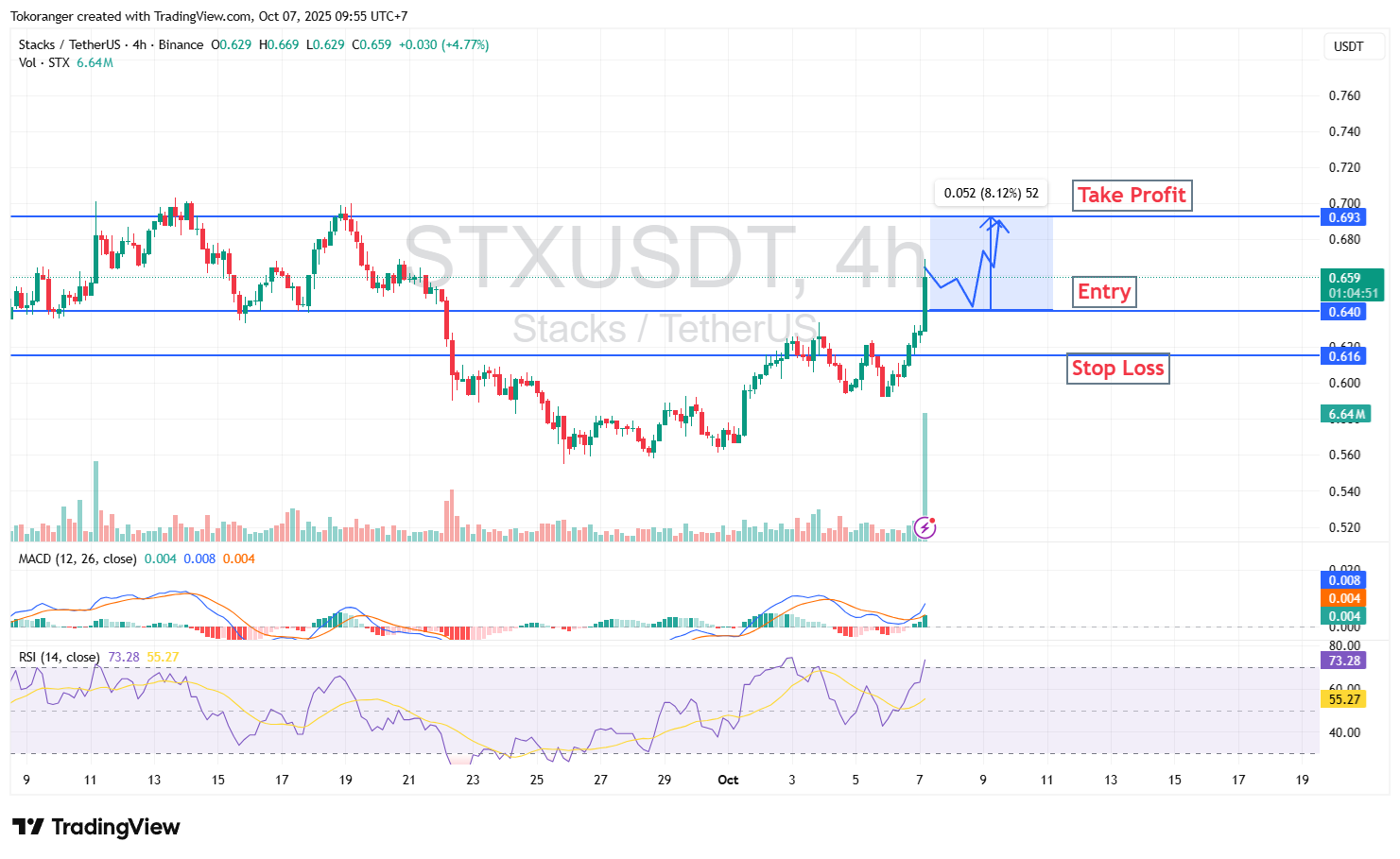 STX/USDT (4H), harga terlihat sedang membentuk momentum bullish kuat setelah berhasil menembus area resistance minor di sekitar $0.640, dengan potensi kenaikan menuju target $0.693 atau sekitar +8%.