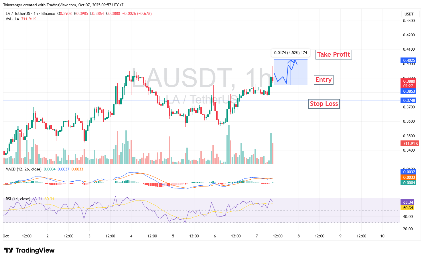 LA/USDT (1H) memperlihatkan potensi mini breakout setelah harga kembali menembus area support kuat $0.3853, dengan target kenaikan menuju resistance $0.4025 atau sekitar +4,5%.