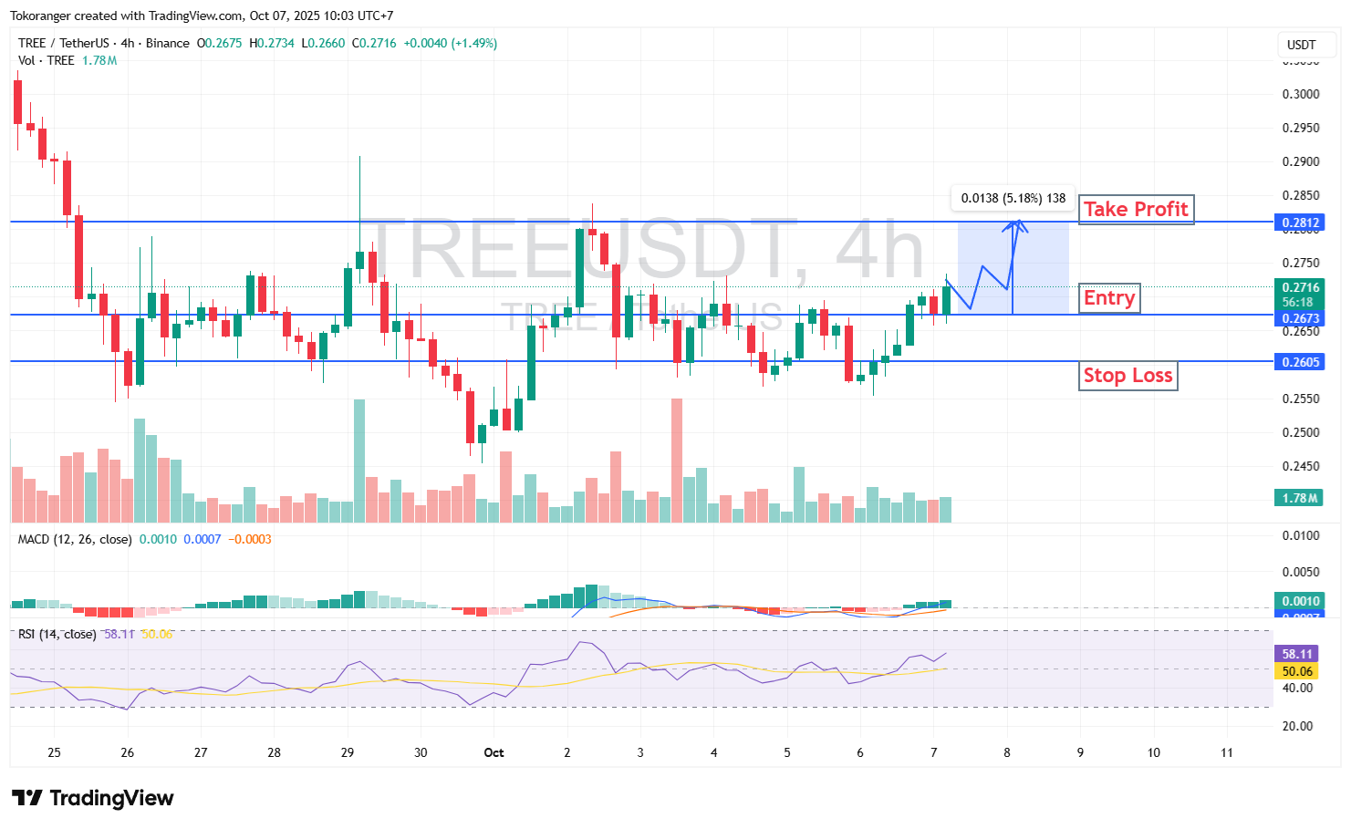 TREE/USDT (4H) menunjukkan sinyal kebangkitan yang mulai matang setelah harga menembus area konsolidasi sempit dan kini bersiap melanjutkan kenaikan menuju resistance $0.2812 dengan potensi profit sekitar +5,1% dari area entry $0.2673.