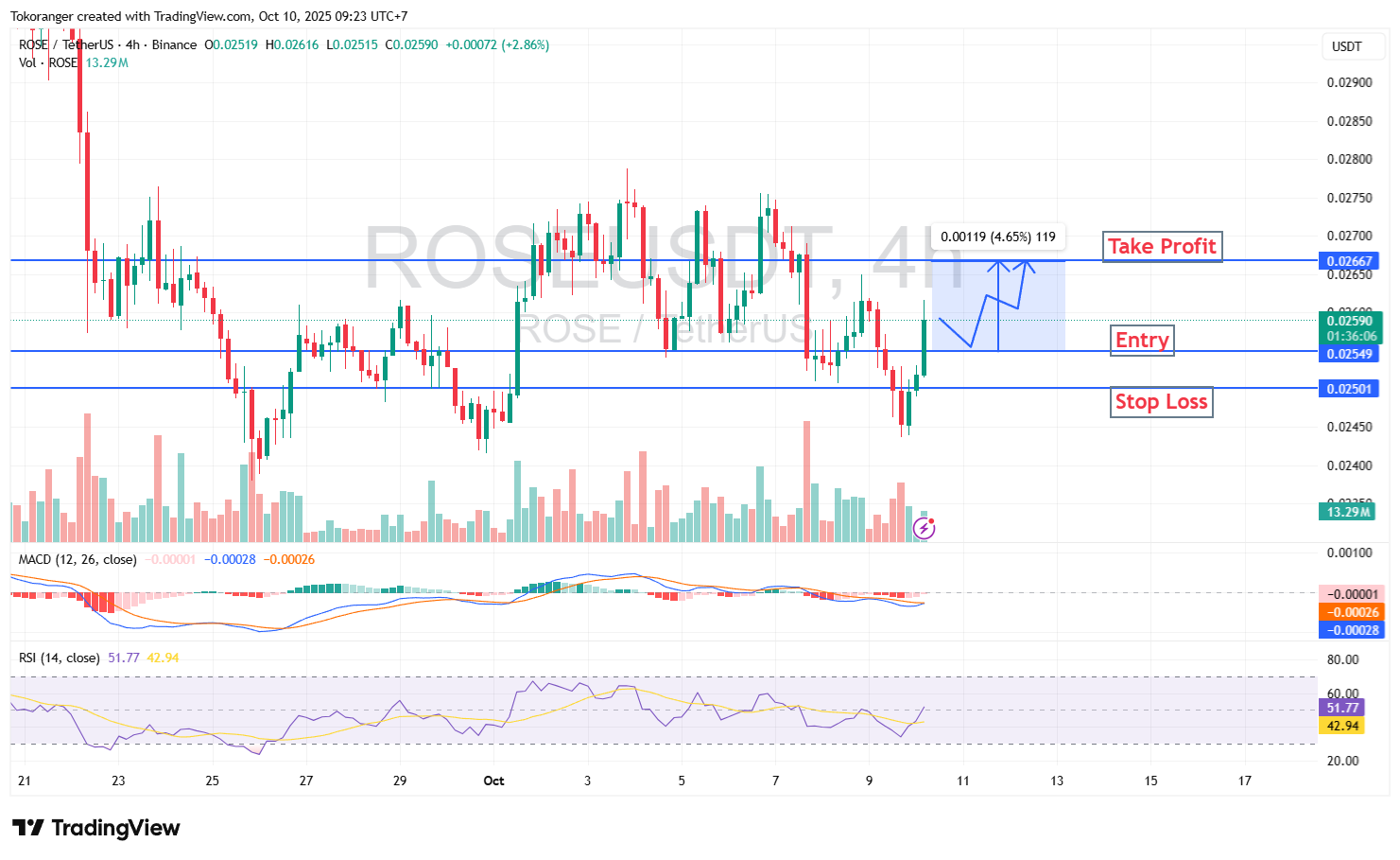 ROSE/USDT (4H) memperlihatkan potensi reversal yang mulai terbentuk setelah harga berhasil menembus kembali area support $0.0250 dan kini mengarah ke resistance $0.0266 dengan peluang kenaikan sekitar 4,6%. Momentum beli mulai terlihat dari RSI 52 yang keluar dari zona jenuh jual, sementara MACD menunjukkan sinyal awal perpotongan positif.