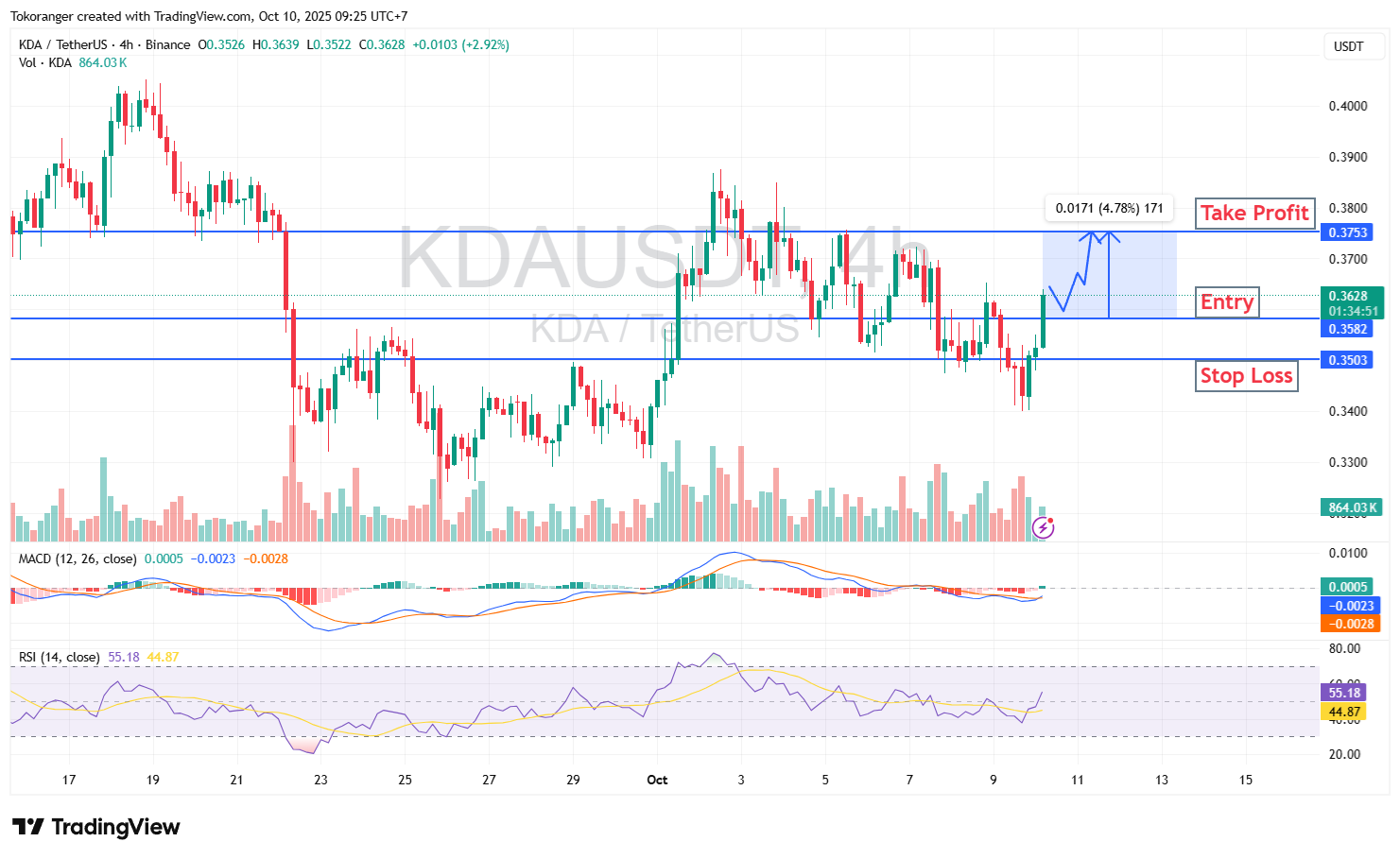 KDA/USDT (4H) menunjukkan tanda kebangkitan setelah harga berhasil memantul dari support $0.3503 dan kini berupaya menuju resistance $0.3753 dengan potensi kenaikan sekitar 4,7%. Indikator MACD mulai menunjukkan potensi bullish crossover, sementara RSI 55 mengindikasikan momentum beli yang perlahan menguat.