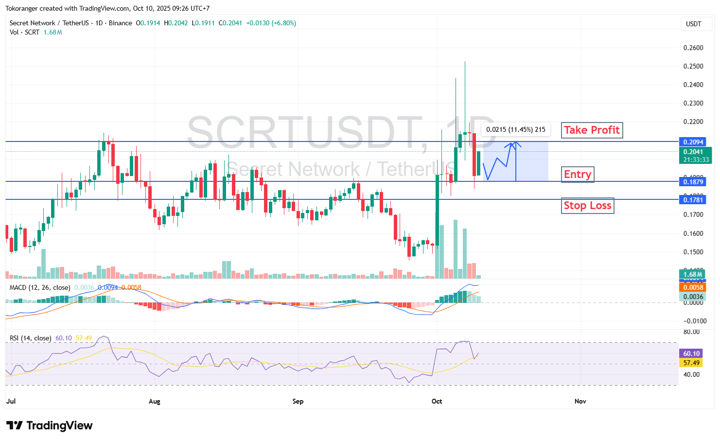 SCRT/USDT (1D) memperlihatkan energi bullish yang mulai pulih setelah harga kembali menembus area penting di $0.1879, dengan potensi kenaikan menuju $0.2094 atau sekitar +11,4%. Indikator RSI di level 59 menunjukkan dorongan beli yang mulai dominan, sementara MACD terus membuka ruang pelebaran sinyal positif.