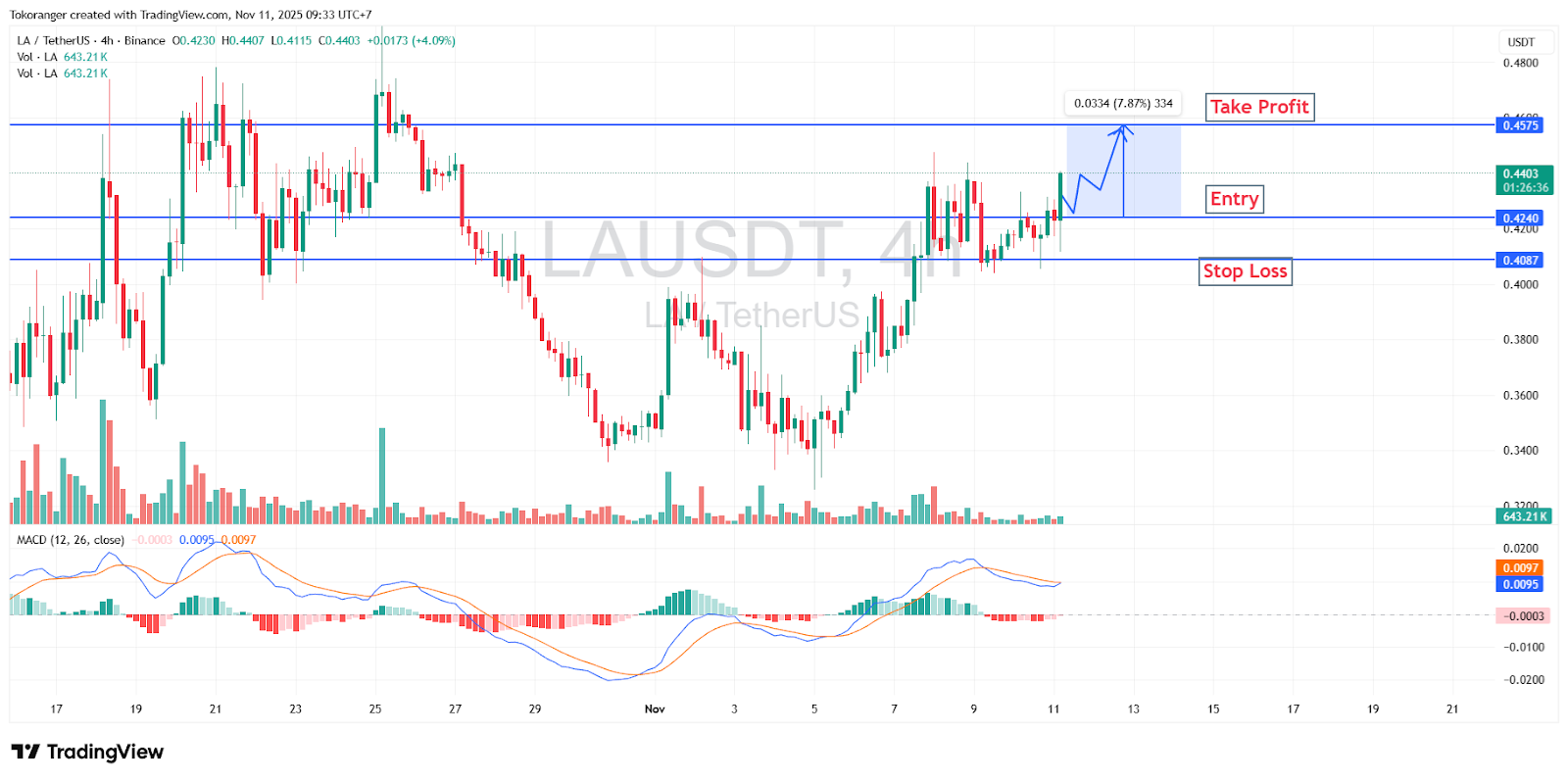 LA/USDT saat ini menunjukkan fase kenaikan bertahap dengan harga yang sudah menembus area konsolidasi dan kini bergerak di atas level entry $0.424, menuju take profit $0.457 (+7.87%). Momentum ini didukung oleh pergerakan MACD yang masih positif meskipun sedikit melandai, menandakan potensi kelanjutan tren asalkan harga tidak kembali turun di bawah support $0.408. Volume perdagangan juga stabil, menunjukkan bahwa buyer masih memegang kendali.