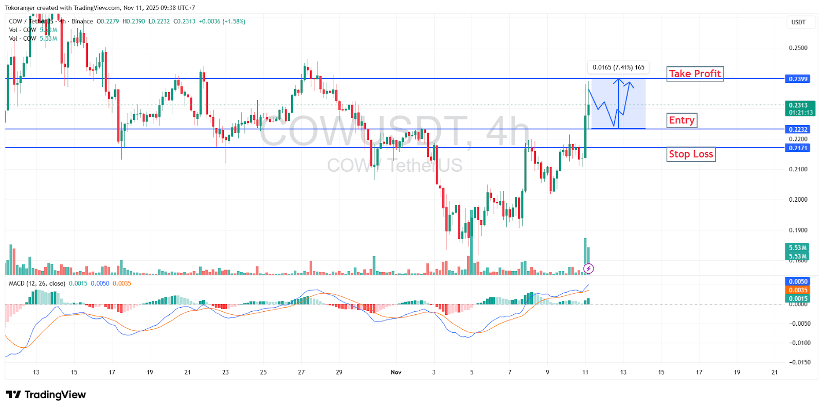COW/USDT tampak sedang menguat dengan dorongan volume besar, menandakan adanya minat beli yang kuat setelah menembus area resistance minor di $0.223. Saat ini harga bergerak stabil di sekitar zona entry $0.2232, dengan target kenaikan menuju $0.2399 (+7.4%) dan stop loss aman di $0.2171. Sinyal MACD yang menanjak tajam di atas garis nol memperkuat momentum bullish ini, seolah-olah mesin “roket” COW sudah mulai menyala.
