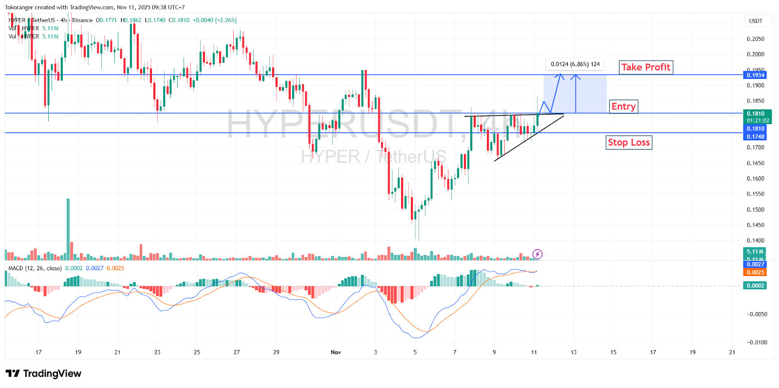 HYPER/USDT sedang membentuk pola ascending triangle, sebuah tanda klasik bahwa pasar mulai bersiap untuk breakout bullish. Harga kini bergerak di atas area entry $0.1810, menandakan buyer mulai mengambil alih kendali dengan potensi target menuju $0.1934 (+6.8%).