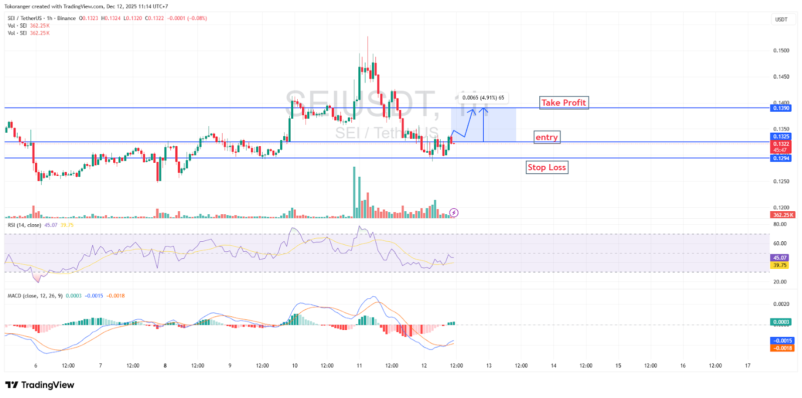 SEI saat ini sedang membangun struktur rebound setelah berhasil memantul dari area support $0.1294, dan muncul sebelum dorongan bullish. Volume mulai meningkat tipis saat harga mendekati area entry $0.1325, menandakan buyer mulai aktif kembali.