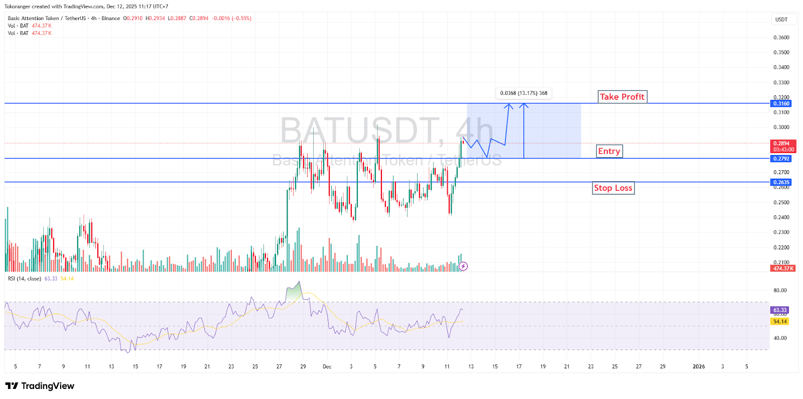 BAT saat ini sedang memantul dari area demand $0.2792 yang biasanya menandakan akumulasi sebelum dorongan lanjutan. Selama candle bertahan di atas level entry ini, peluang menuju resistance $0.3160 tetap terbuka lebar, apalagi RSI yang mulai mengarah naik memperlihatkan peningkatan tenaga beli. MACD pun sudah mendekati zona bullish crossover, menandakan momentum mulai berubah arah.