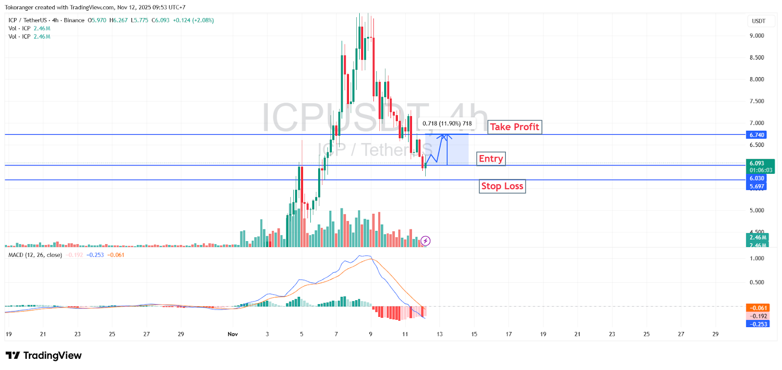 ICP/USDT saat ini terlihat mencoba bangkit dari fase retracement setelah penurunan tajam dari area $8 menuju $5.7. Harga kini bergerak di sekitar zona entry $6.03, dengan potensi rebound menuju target $6.74 (+11.9%) apabila tekanan beli terus berlanjut. Volume perdagangan menunjukkan adanya minat beli yang mulai meningkat, sementara MACD mulai mendekati area golden cross, memberi sinyal awal potensi pembalikan arah.
