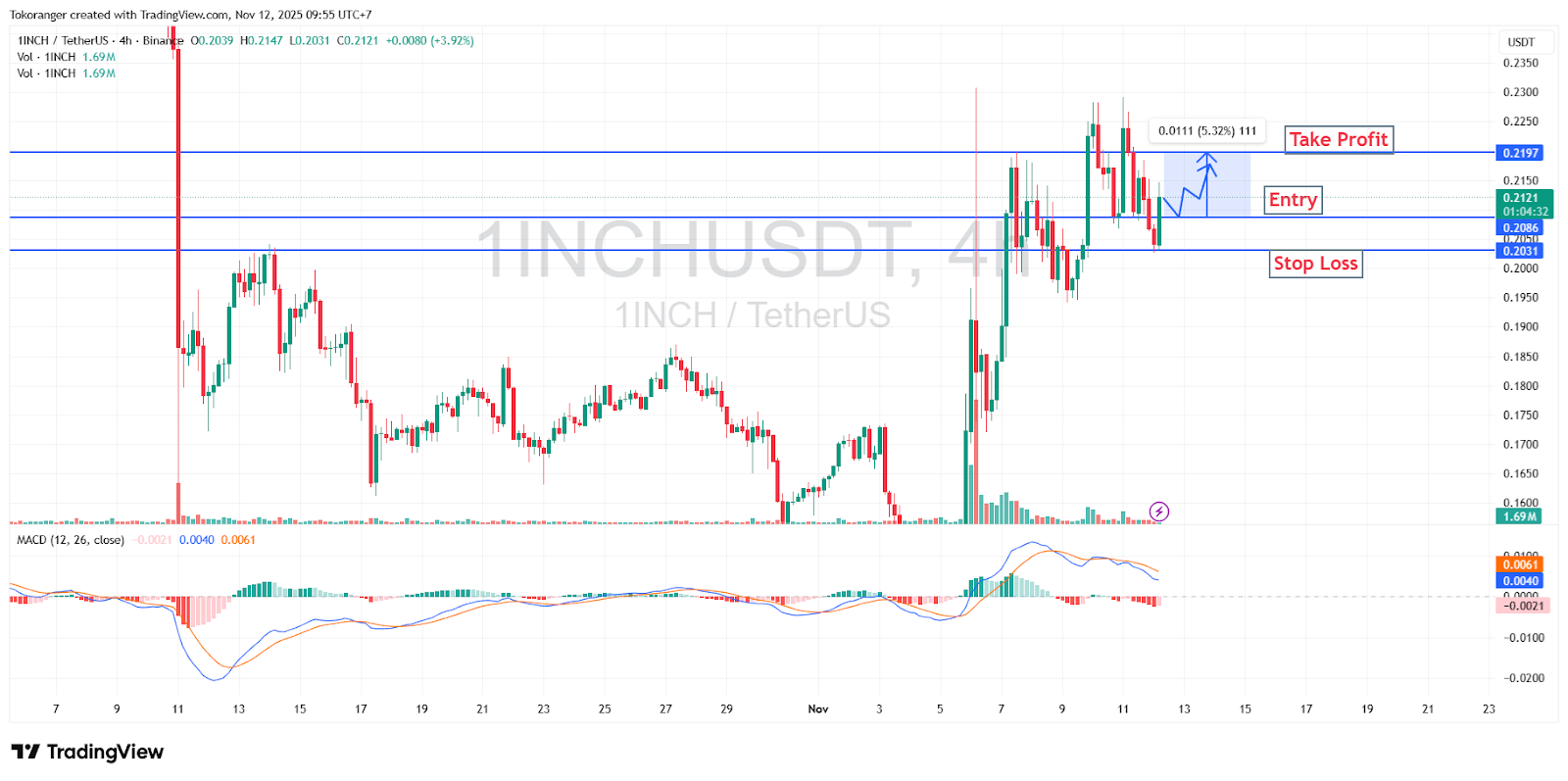 1INCH/USDT saat ini sedang menguji area konsolidasi di sekitar $0.2086 yang menjadi titik entry potensial untuk melanjutkan tren naik menuju target $0.2197 (+5.3%). Struktur harga menunjukkan adanya pola higher low yang menandakan tekanan beli mulai menguat meski momentum masih terbatas. Indikator MACD mulai merapat, mengindikasikan potensi cross bullish apabila volume beli meningkat.