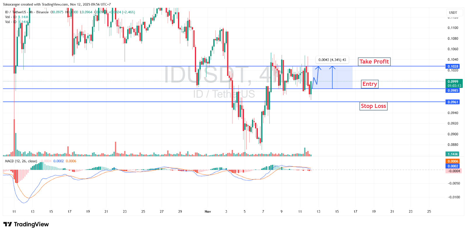 ID/USDT saat ini sedang bergerak dalam fase sideway antara area support $0.0961 dan resistance $0.1028, dengan peluang entry menarik di sekitar $0.0985. Struktur harga menunjukkan upaya pembeli mempertahankan area bawah, menandakan potensi pantulan ke arah resistance atas. MACD masih bergerak mendatar, menandakan momentum belum dominan, namun ini bisa jadi sinyal akumulasi sebelum breakout kecil.