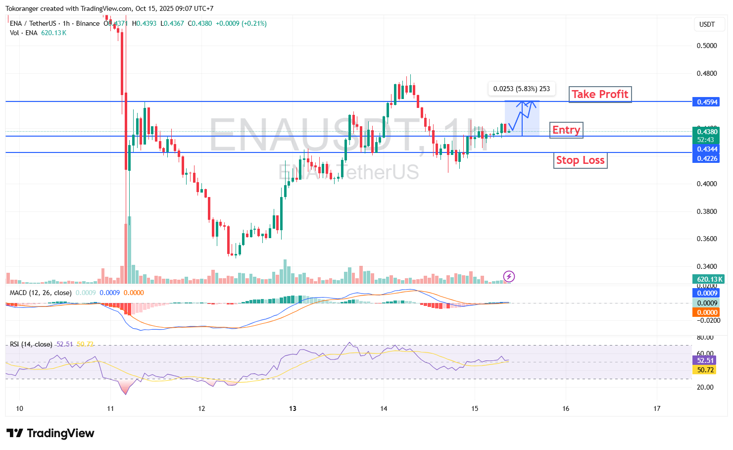 ENA/USDT (1H) memperlihatkan sinyal awal kebangkitan setelah fase konsolidasi di sekitar $0.43, di mana harga mulai menanjak perlahan dan membentuk struktur higher low. Indikator MACD yang mulai mendekati golden cross menandakan potensi momentum beli baru, sementara RSI di level 53 menunjukkan ruang yang masih cukup luas untuk kenaikan tanpa tekanan jual berlebih.